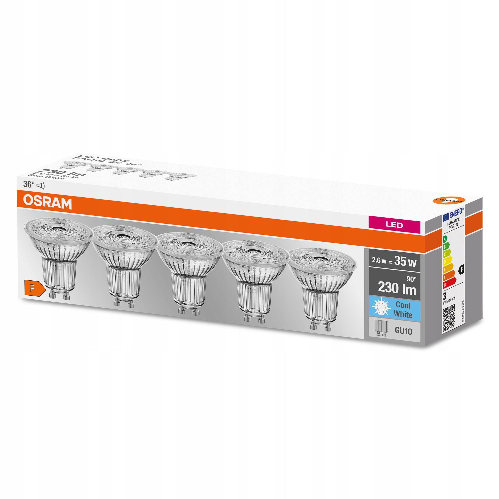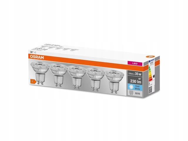 Zestaw 5x ŻARÓWEK LED GU10 2,6W 4000K 230lm OSRAM. Jest to źródło światła z trzonkiem GU10 o mocy 2,6W (odpowiednik klasycznej żarówki o mocy 35W). Halogen ten emituje zimną barwę światła 4000K o strumieniu świetlnym 230lm.