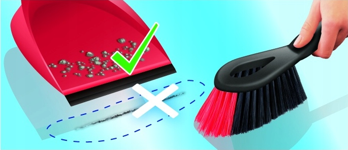 - Szufelka zakończona praktyczną gumką, dzięki czemu precyzyjnie można zgarnąć na nią brud i kurz.