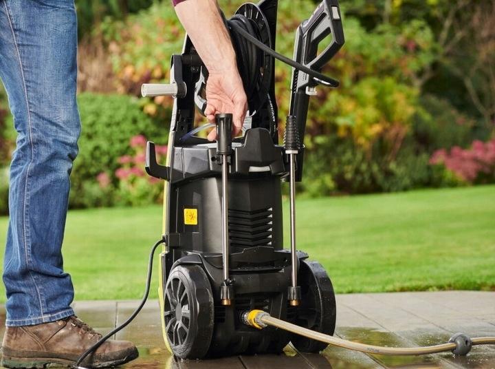 - Zwijacz węża pod ciśnieniem odwija wąż podczas użytkowania bez przewracania urządzenia, co pozwala na maksymalną swobodę poruszania się po ogrodzie