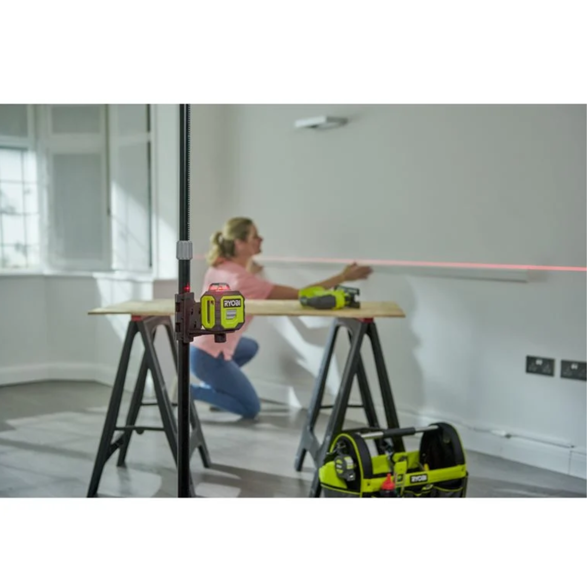 Prace wokół domu z wykorzystaniem poziomicy jeszcze nigdy nie było tak łatwe dzięki nowemu laserowi Red Line RB360RLL RYOBI® 360°. Dzięki zastosowaniu lasera o poziomej wiązce 360° i zasięgu 20 m możliwa jest praca na wielu powierzchniach ścian i powierzchni bez ponownej regulacji lub przestawiania narzędzia, co pozwala nam zaoszczędzić czas, wykonując zadanie szybciej i bardziej precyzyjnie.