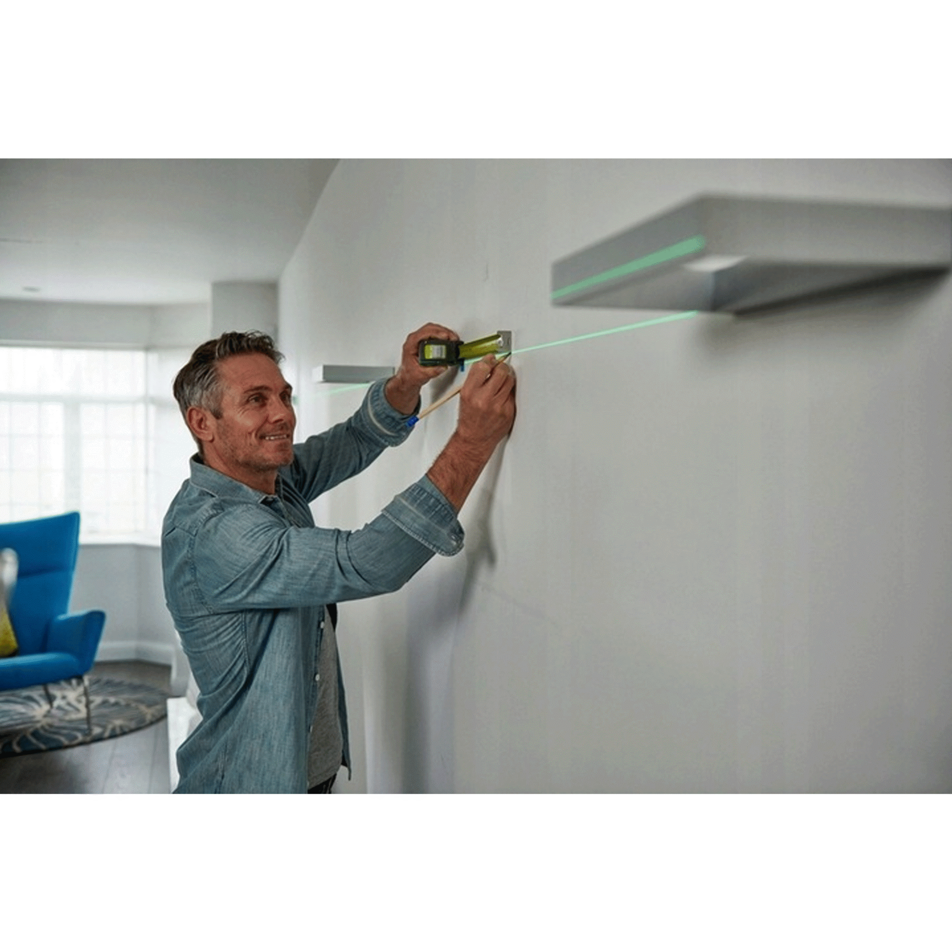 Zielony laser liniowy RB360GLL Ryobi jest bardzo dobrze widoczny w każdych warunkach. Doskonale sprawdza się do wieszania półek czy desek na tej samej wysokości, ale na kilku ścianach, gdyż emituję wiązkę 360°. Urządzenie oferuje również emitowanie jednej wiązki, w razie gdy zajdzie taka potrzeba. Funkcja samopoziomowania usprawnia użytkowanie – o odpowiednim wypoziomowaniu informuje dioda LED. Obudowa pokryta gumą chroni urządzenie przed uszkodzeniami mechanicznymi. Kompaktowa konstrukcja pozwala wygodnie przenosić i przechowywać model.