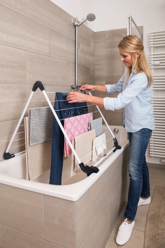 Dzięki niewielkim rozmiarom po złożeniu, suszarka na bieliznę może być łatwo przechowywana, na przykład za szafką w łazience lub pralką.