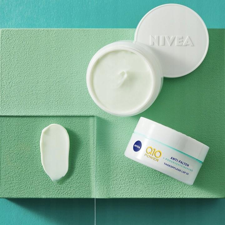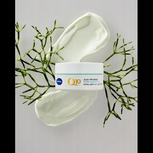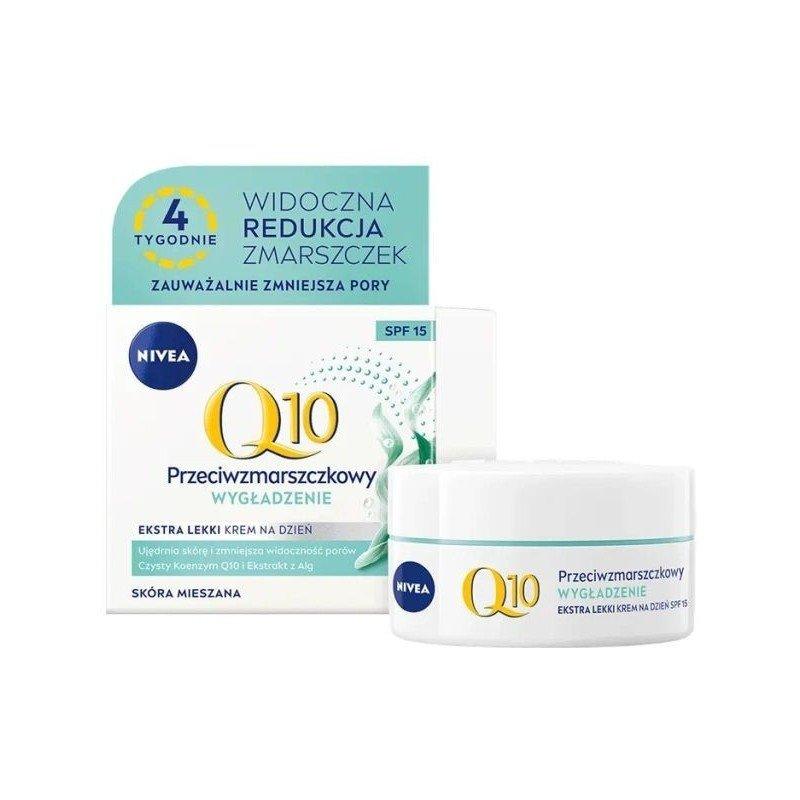 NIVEA Q10 Wygładzenie Przeciwzmarszczkowy ekstra lekki krem na dzień z SPF 15 ujędrnia skórę i zmniejsza widoczność porów jednocześnie redukując zmarszczki. Krem do twarzy zawiera najczystszy, identyczny jak w skórze Koenzym Q10, który zapewnia podwójną siłę działania. Chroni komórki skóry przed czynnikami zewnętrznymi oraz dodaje zastrzyk energii pomagając w procesie ich regeneracji*. Zawiera ekstrakt z alg, znany z właściwości antybakteryjnych. Normalizująca, lekka formuła z SPF 15 idealna do cery mieszanej zmniejsza widoczność porów, aby skóra wyglądała na naturalnie gładką.