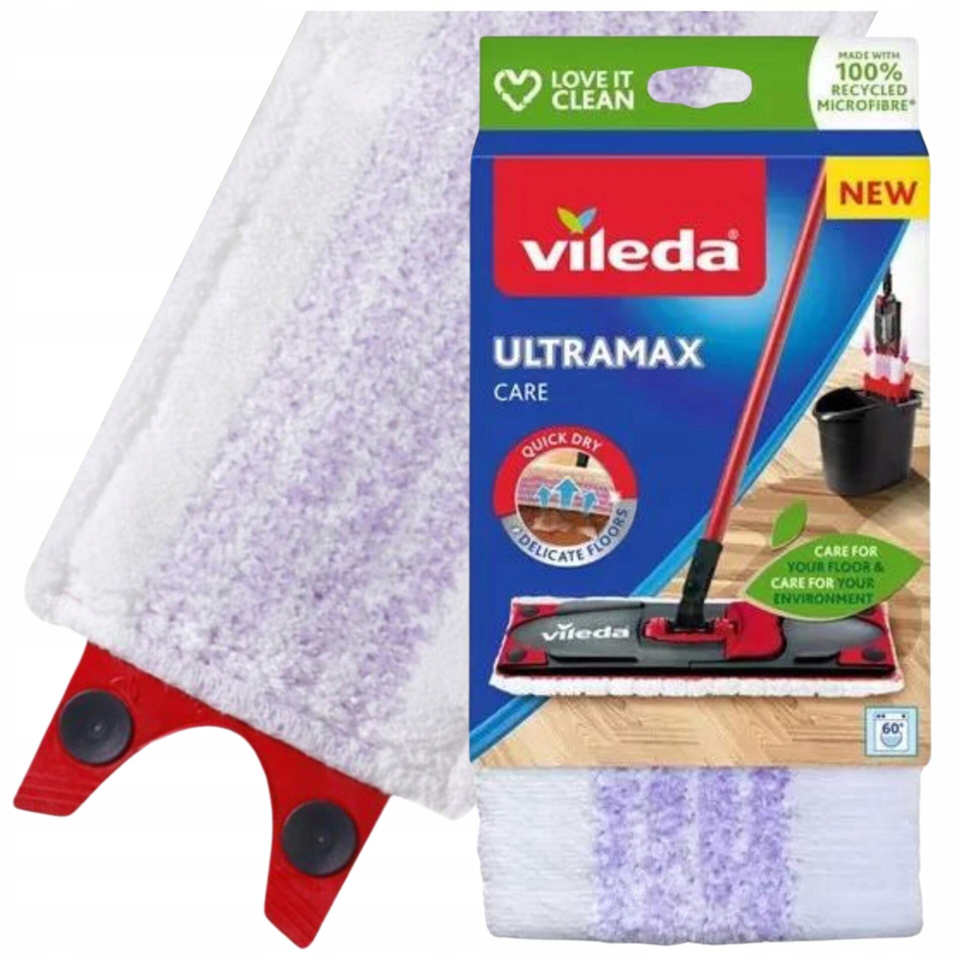 Wkład do mopa płaskiego Vileda Ultramax Care doskonale czyści najdelikatniejsze podłogi. Fioletowe włókna usuwają zanieczyszczenia i włosy. Białe włókna wykonane w 100% z mikrofibry z recyklingu wycierają podłogę do sucha i polerują ją.