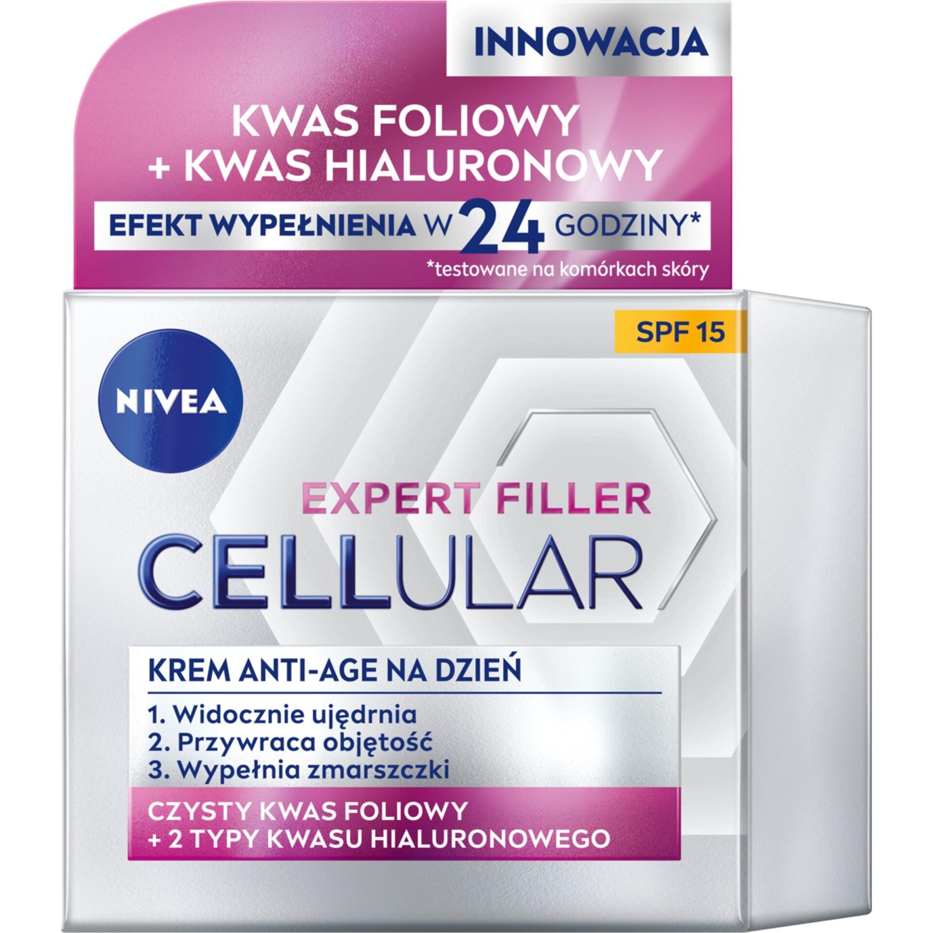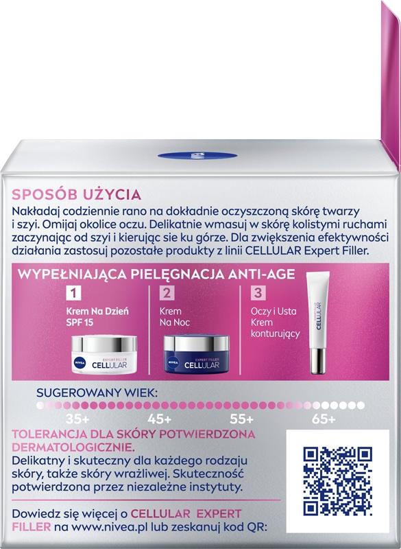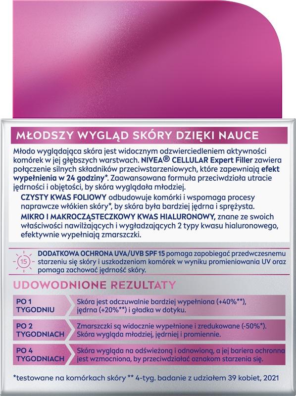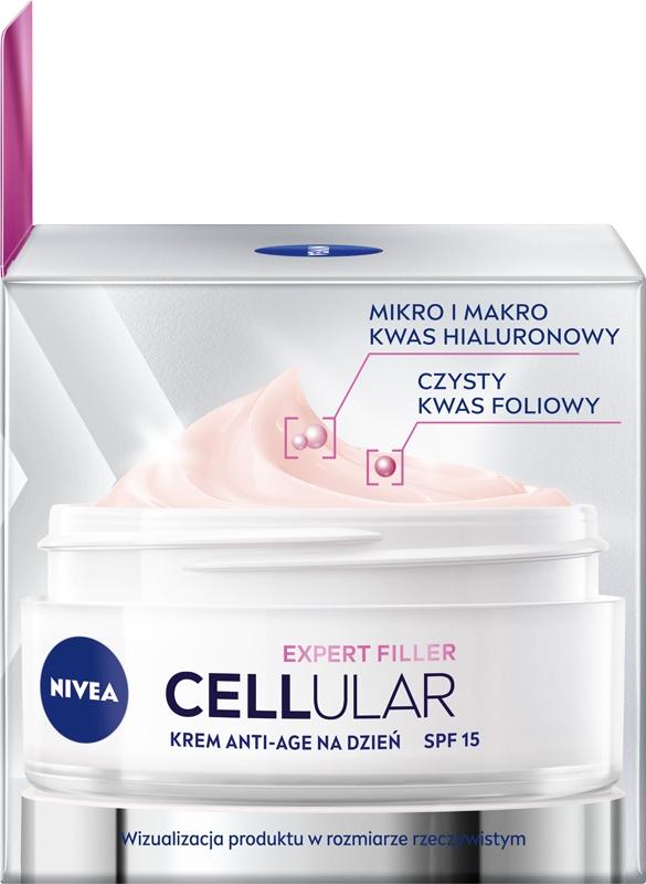 Zaawansowany krem anti-age na dzień NIVEA CELLULAREXPERT FILLER zawiera połączenie składników aktywujących komórki skóry*: Czystego Kwasu Hialuronowego i Boostera Kolagenu. Dzięki temu zaawansowana formuła aktywuje komórki skóry do produkcji własnego kwasu hialuronowego i kolagenu* oraz usprawnia proces odnowy komórek, przyspieszając naturalną regenerację skóry. Krem anti-age na dzień zawiera system filtrów UVA/UVB (SPF 15), który pomaga chronić skórę przed fotostarzeniem, uszkodzeniem komórek i przebarwieniami wywołanymi promieniowaniem UV. Dzięki jedwabistej, rozpieszczającej teksturze, szybko się wchłania i delikatnie wtapia w skórę.