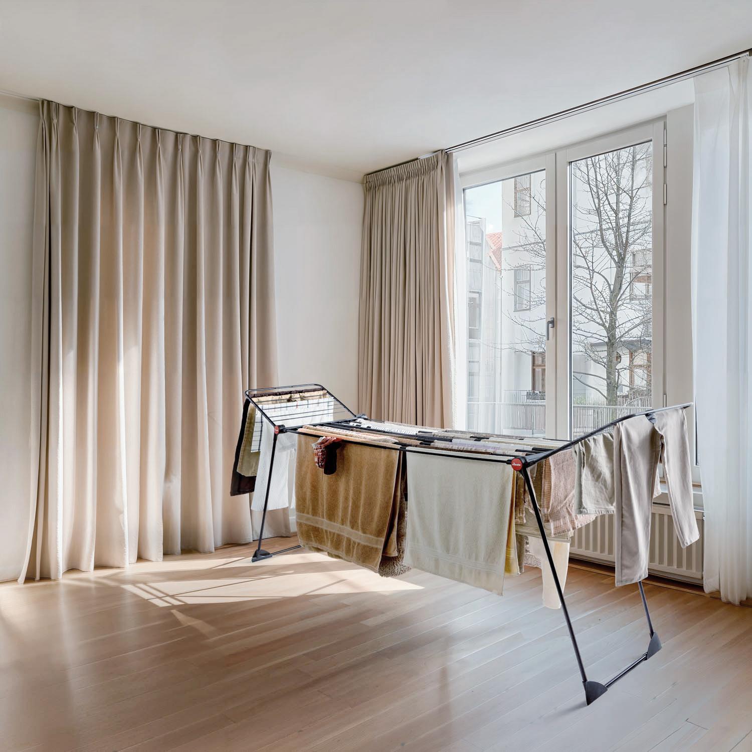 Wysokie skrzydła oferują dużo dodatkowej przestrzeni: osiągając maksymalną wysokość 1,28 m, umożliwiają wieszanie bardzo długich ubrań, takich jak spodnie czy sukienki, tak aby nie dotykały podłogi. Niezłożone na kilka części ubrania to też szybszy czas suszenia!
