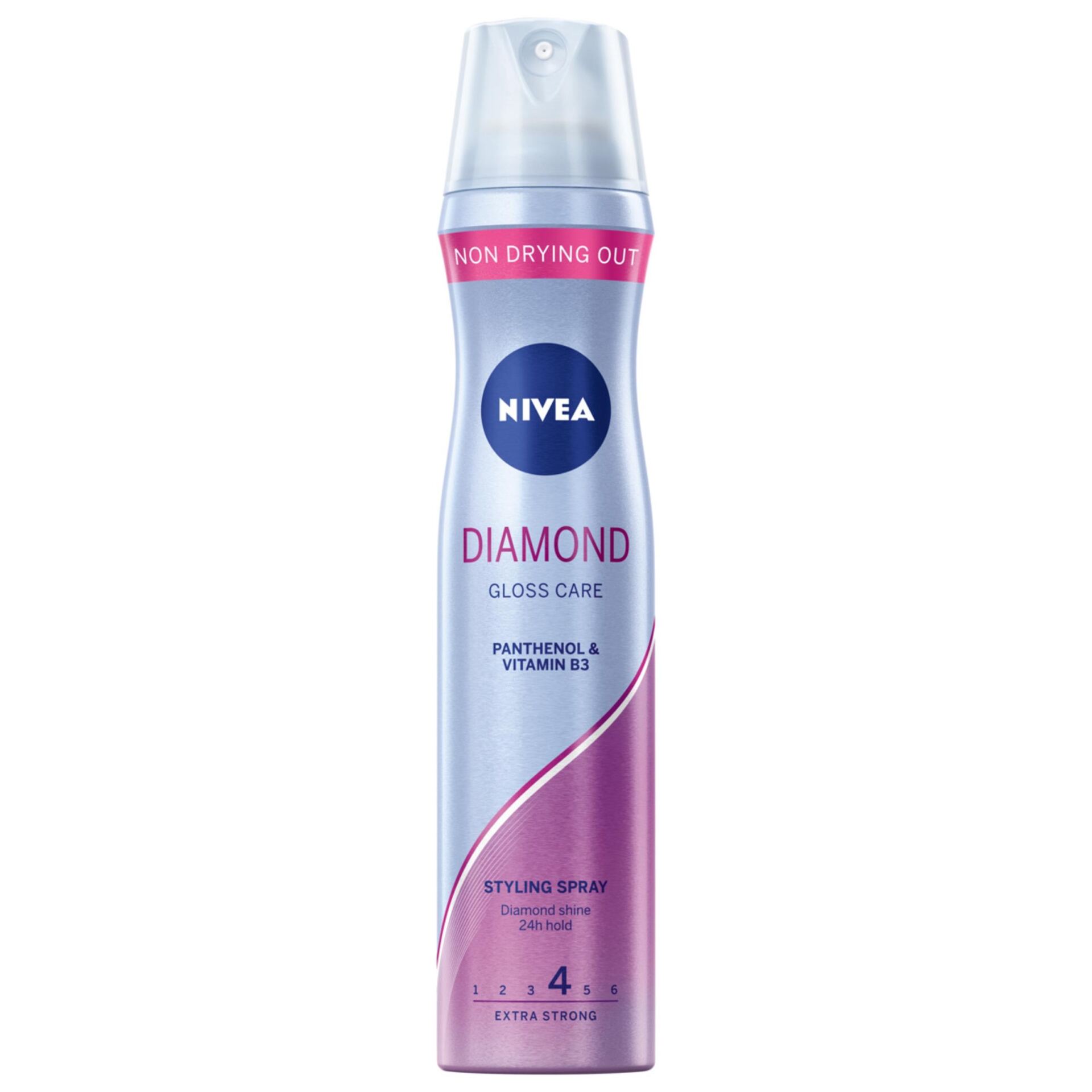 Lakier do włosów NIVEA Diamond Gloss Care. Ulepszona formuła z pantenolem i witaminą B3 wzmacnia i chroni Twoje włosy. Lakier przeznaczony do włosów normalnych, pozbawionych blasku sprawia, że fryzura zyskuje diamentowy połysk i długotrwałe utrwalenie – nawet do 24 godzin. Lakier pielęgnuje i wzmacnia włosy, łatwo się wyczesuje. Fryzura utrzymuje się przez wiele godzin, włosy pozostają miłe w dotyku i zachowują świeży wygląd.