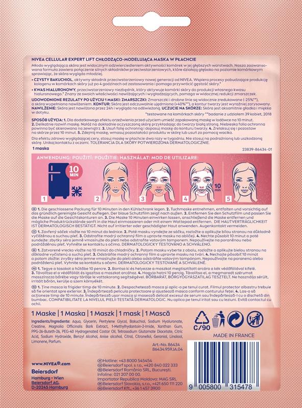 NIVEA Cellular Expert Lift Chłodząco- modelująca maska w arkuszu zawiera połączenie silnych składników przeciwstarzeniowych: CZYSTY BAKUCHIOL, który wspiera procesy pobudzające produkcję kolagenu w komórkach skóry już po 4h od zastosowania i pomaga przywrócić gęstość skóry*, oraz KWAS HIALURONOWY, aktywujący komórki skóry do produkcji własnego kwasu hialuronowego*. Maseczka do twarzy nawilża i wygładza skórę, pomagając w widocznej redukcji zmarszczek. Użycie maski w płachci z serii Cellular zapewnia efekt aksamitnej, gładkiej i miękkiej w dotyku cery.