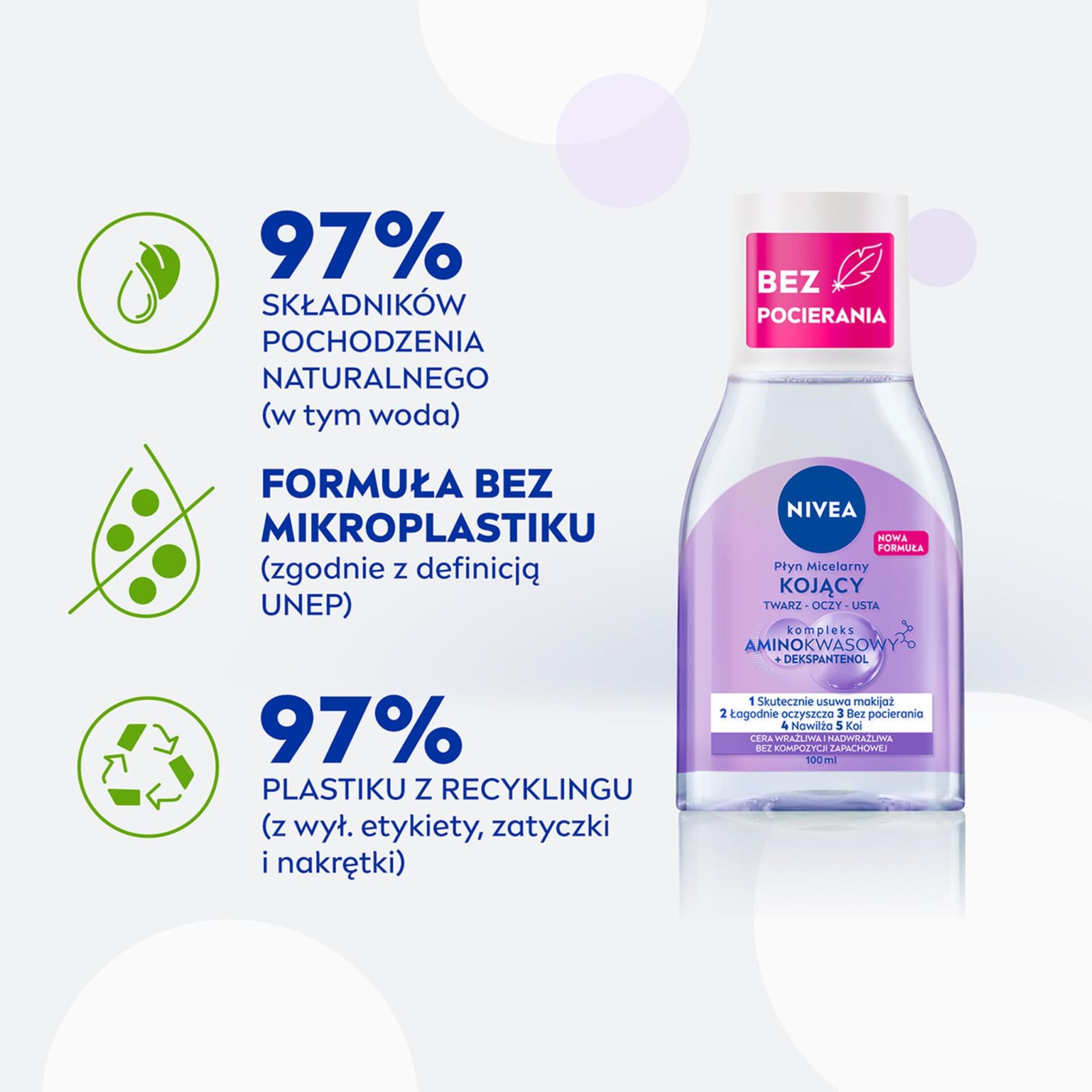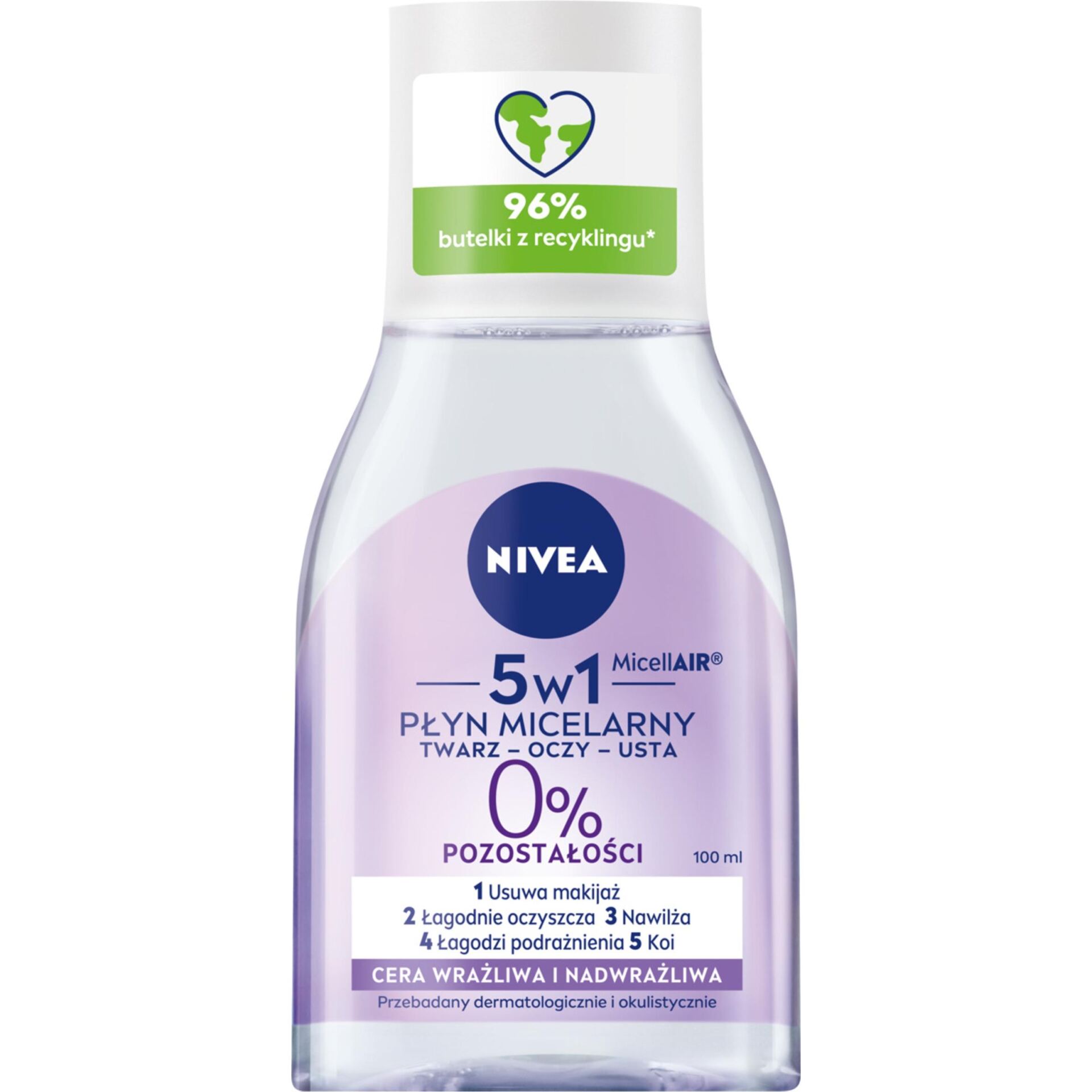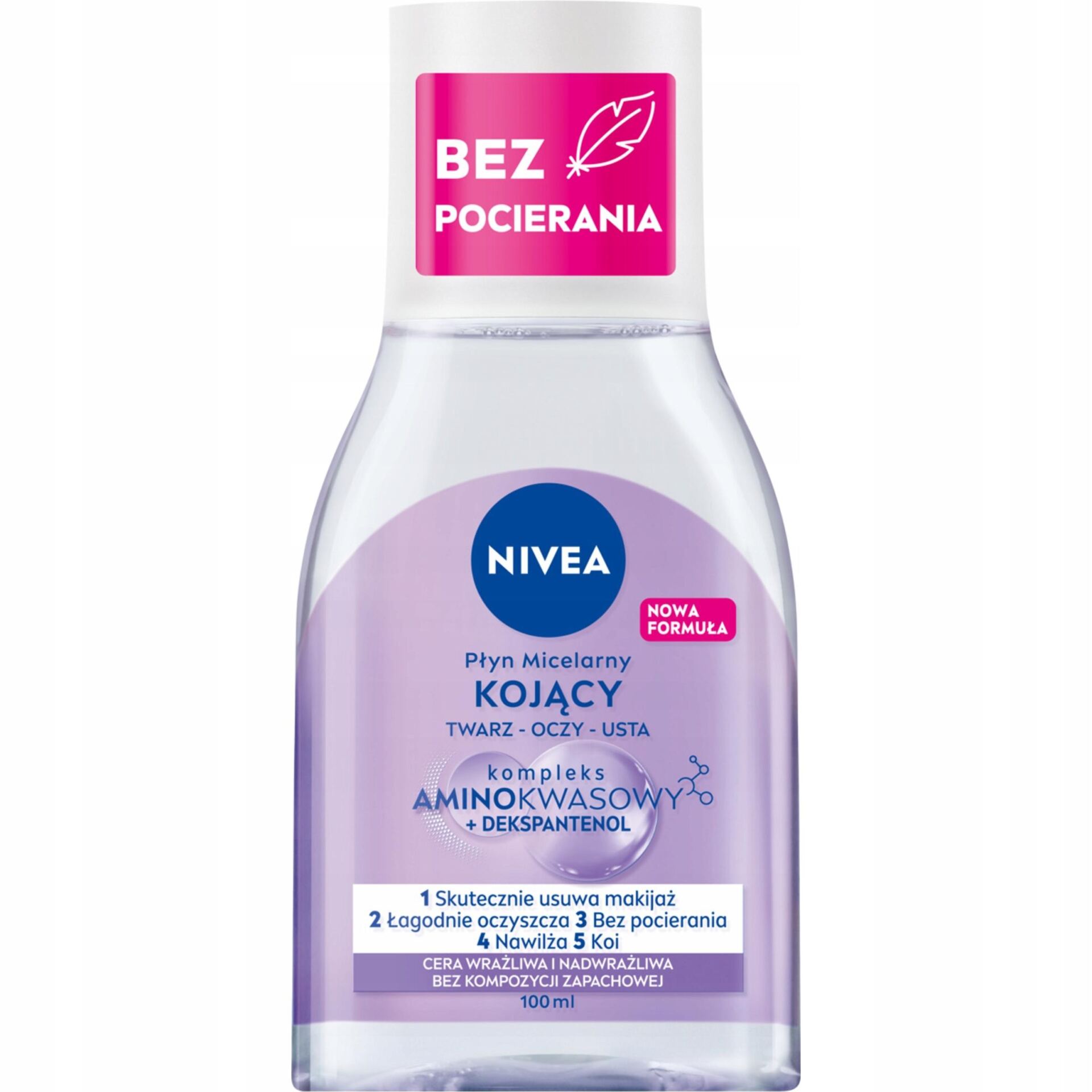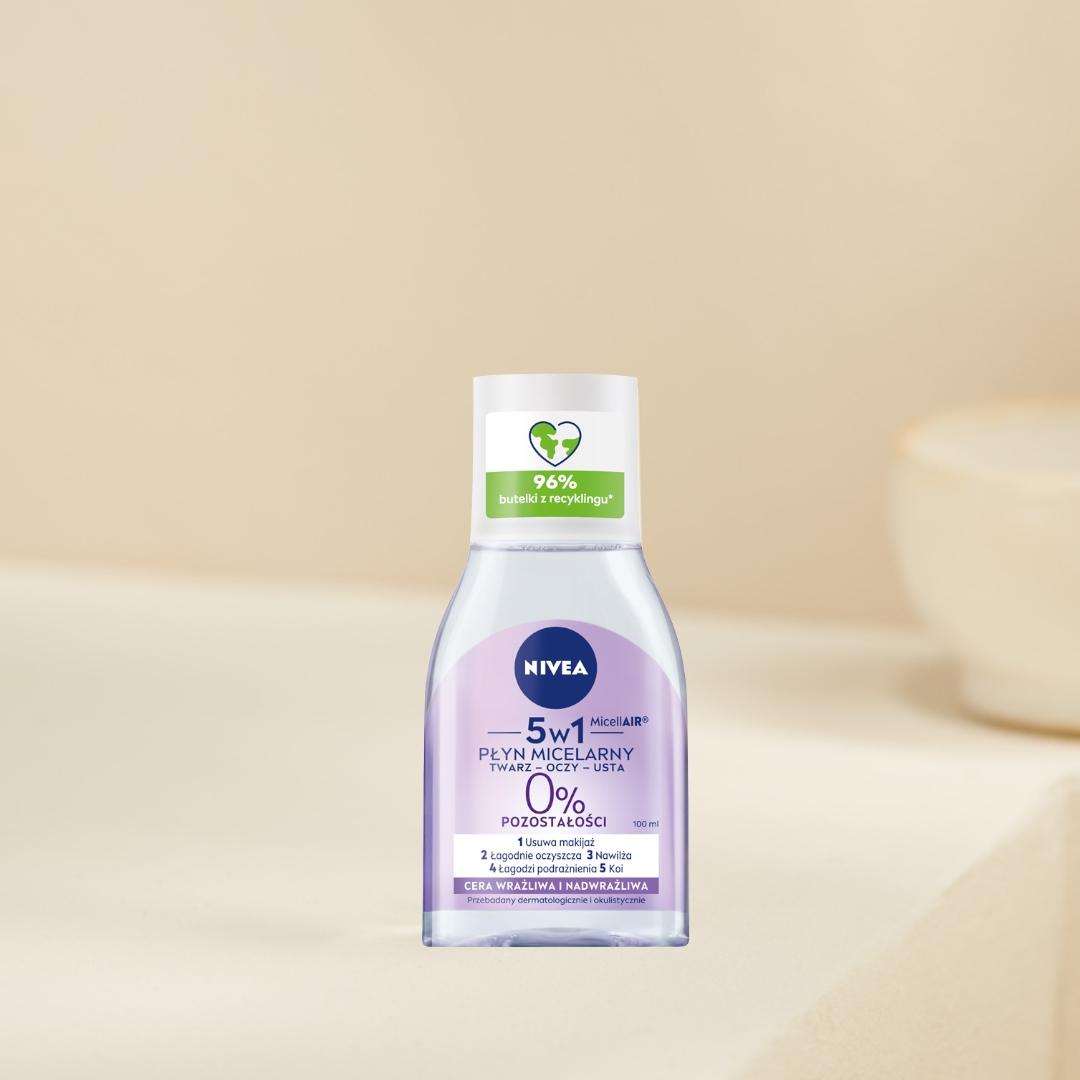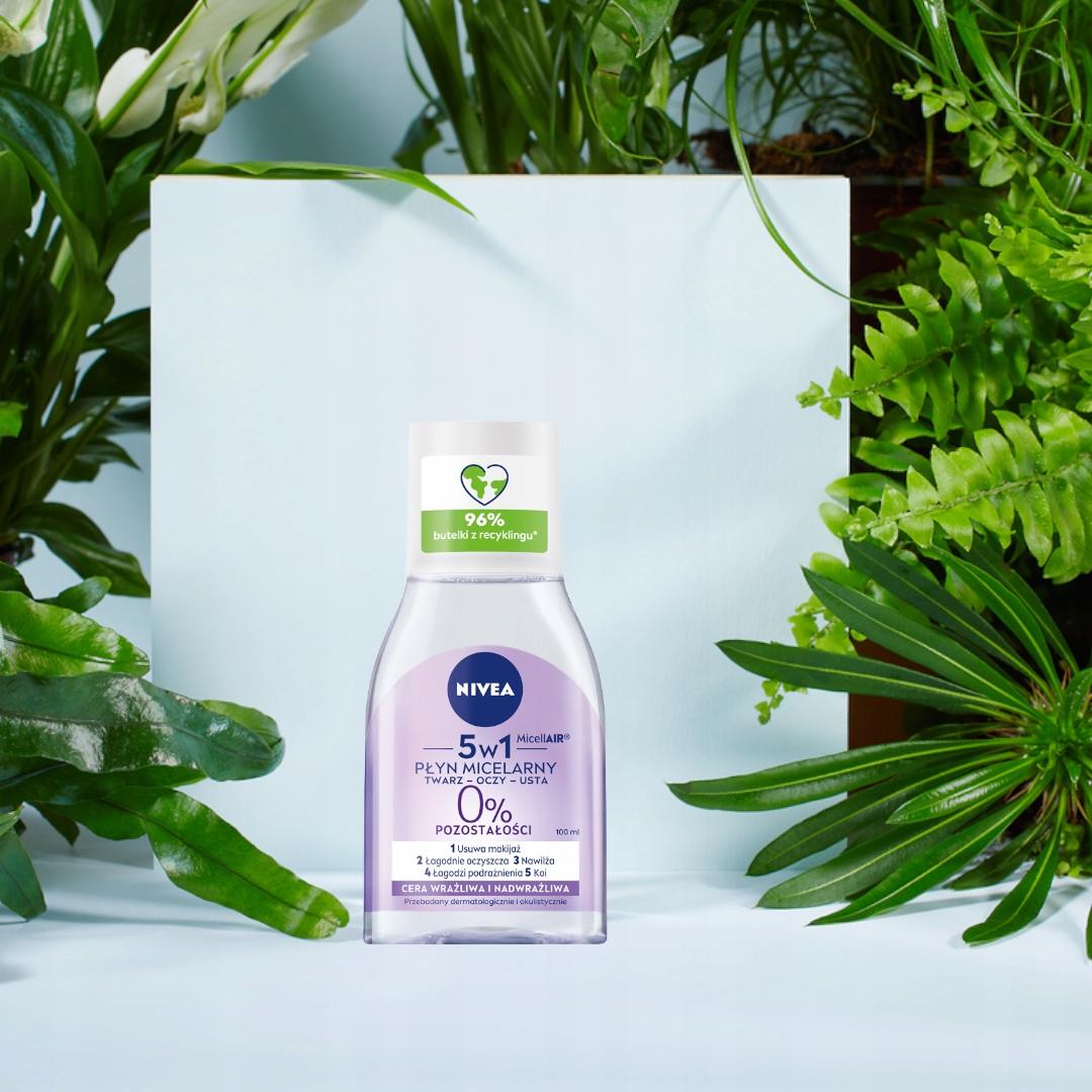 Właśnie dlatego powstał kojący płyn micelarny – wielozadaniowa formuła z kompleksem aminokwasowymi dekspantenolem efektywnie usuwa makijaż oraz łagodnie oczyszcza wrażliwą i nadwrażliwą skórę, przywracając jej komfort. Płyn micelarny świetnie sprawdzi się do demakijażu twarzy, oczu oraz ust, nawet w przypadku najbardziej wrażliwej cery. Wyjątkowo łagodna formuła bez kompozycji zapachowej dokładnie ją oczyszcza, a jednocześnie łagodzi podrażnienia, koi i pomaga redukować 3 oznaki cery wrażliwej: zaczerwienienie, napięcie i suchość. Skuteczność płynu micelarnego NIVEA jest widoczna gołym okiem – nie wymaga pocierania, aby w pełni usunąć makijaż, bez pozostałości i tłustego filmu na skórze. Tolerancja dla skóry potwierdzona dermatologicznie.