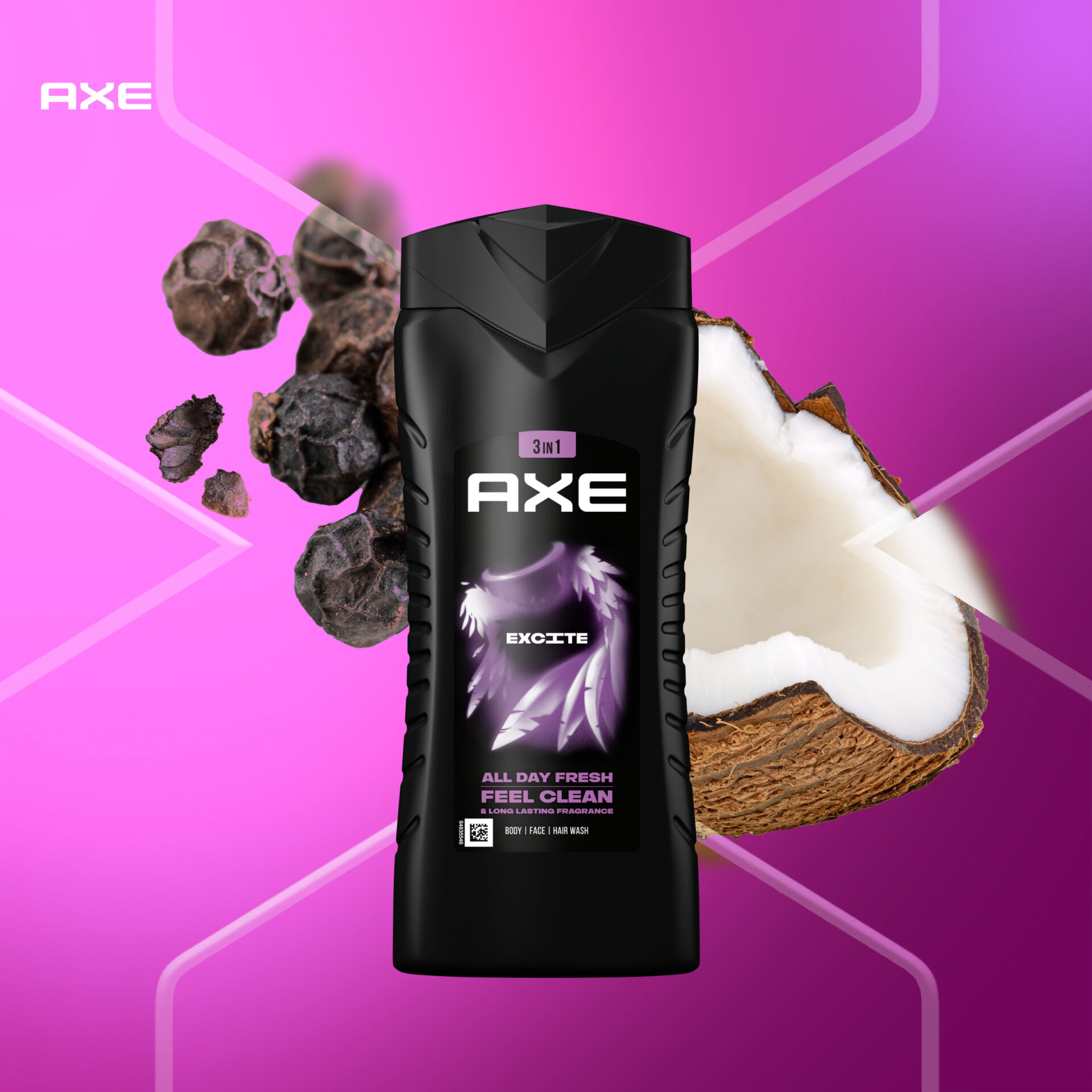 Żel pod prysznic AXE Excite 3 w 1 to jeden kosmetyk do wszystkiego – doskonale oczyszcza i pielęgnuje ciało, twarz oraz włosy.