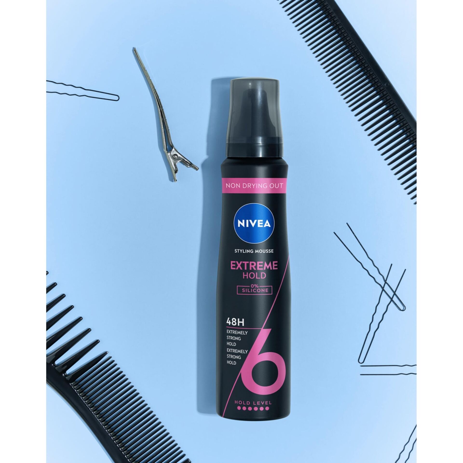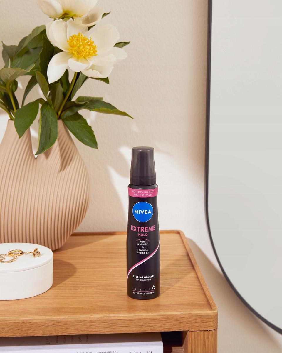 Pianka do włosów NIVEA Extreme Hold zapewnia wyjątkowo silną kontrolę nad stylizacją i wzmacnia włosy, zapewniając im niezawodne utrwalenie aż do 48 godzin. Formuła bez silikonu z ochroną przed wysoką temperaturą, wzbogacona o Pantenol i Witaminę B3, która wzmacnia i chroni włosy przed zewnętrznymi uszkodzeniami i stresorami.