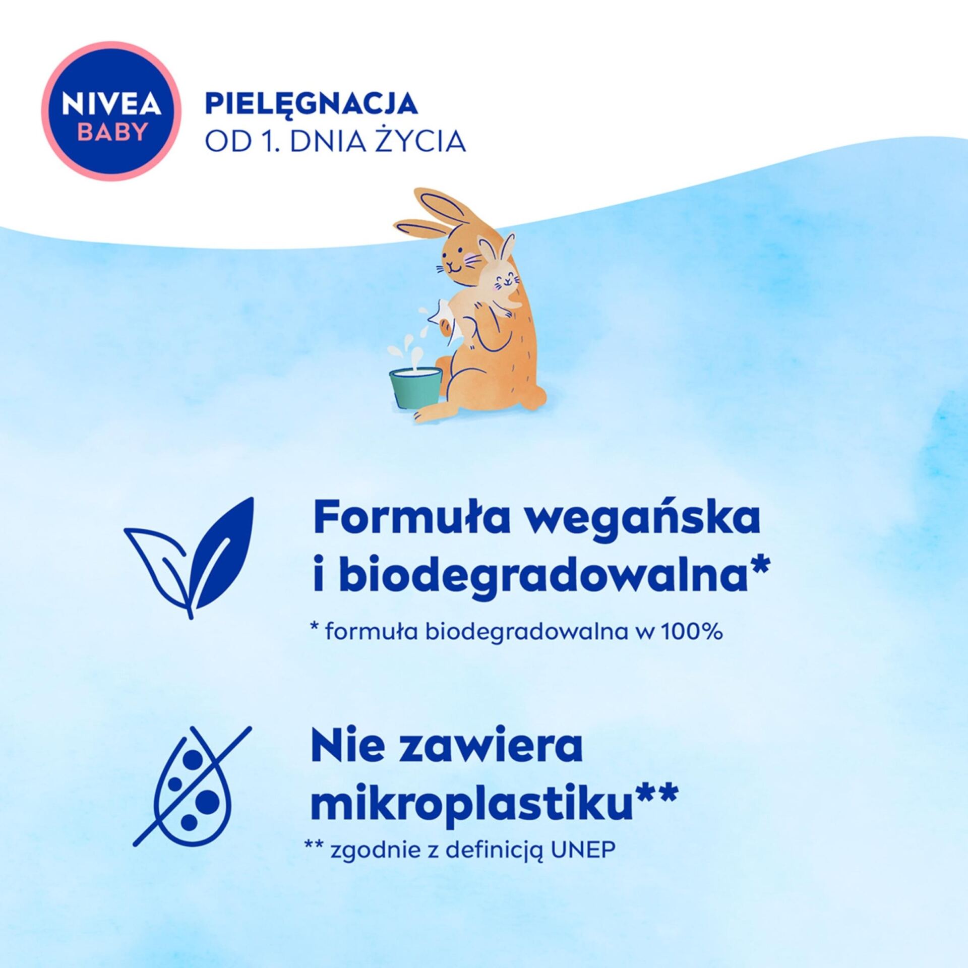 Nasze nowe formuły są łagodne i dbają o delikatną skórę dziecka i naszą planetę. Formuła jest wegańska, biodegradowalna^ i nie zawiera mikroplastiku^^.