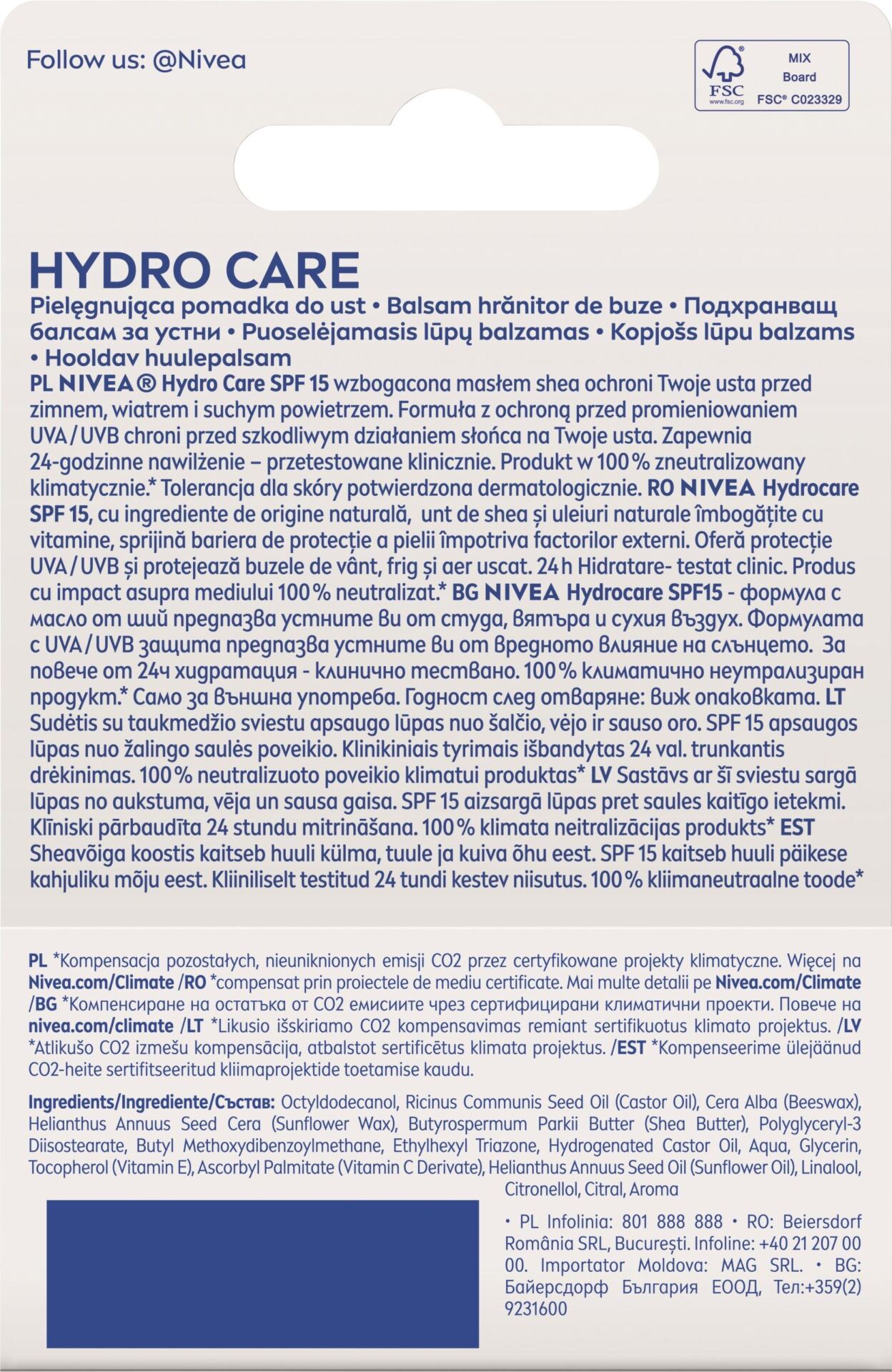 - Pomadka NIVEA zawiera filtr SPF 15 chroniąc przed szkodliwym wpływem promieni słonecznych