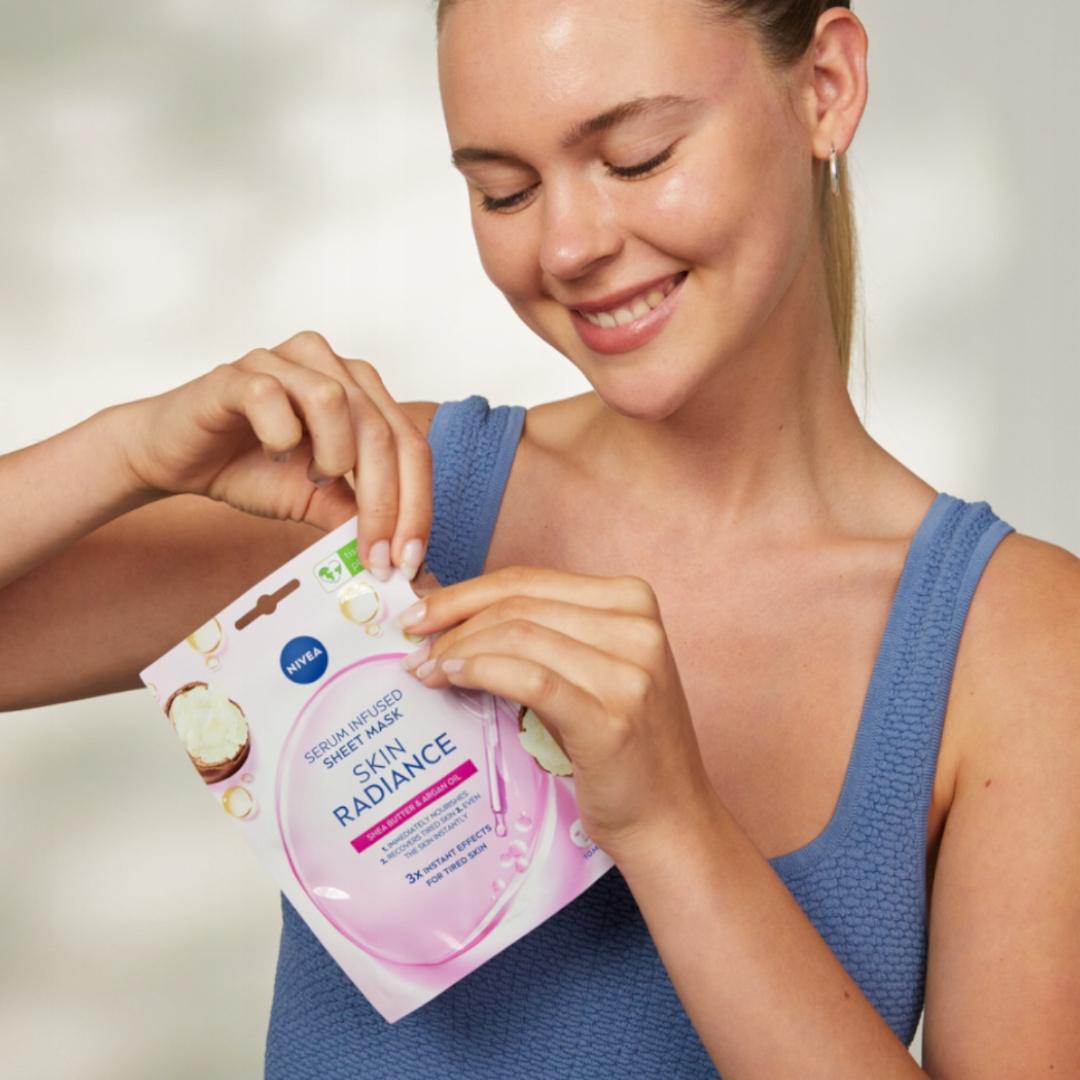 Codzienny stres, środowisko i zanieczyszczenia mogą sprawić, że skóra będzie wyglądać na szarą i zmęczoną. Poświęć 10 minut na relaks i pozwól maseczce w płachcie NIVEA SKIN RADIANCE przywrócić Twojej skórze zdrowy blask. Maseczka w płachcie zawiera 20 ml serum, olejek arganowy i masło shea. Aby zapewnić skórze zdrowy wygląd, stosuj maseczkę w płachcie dwa razy w tygodniu. Dla jeszcze przyjemniejszego efektu, umieść maskę w lodówce przed użyciem.