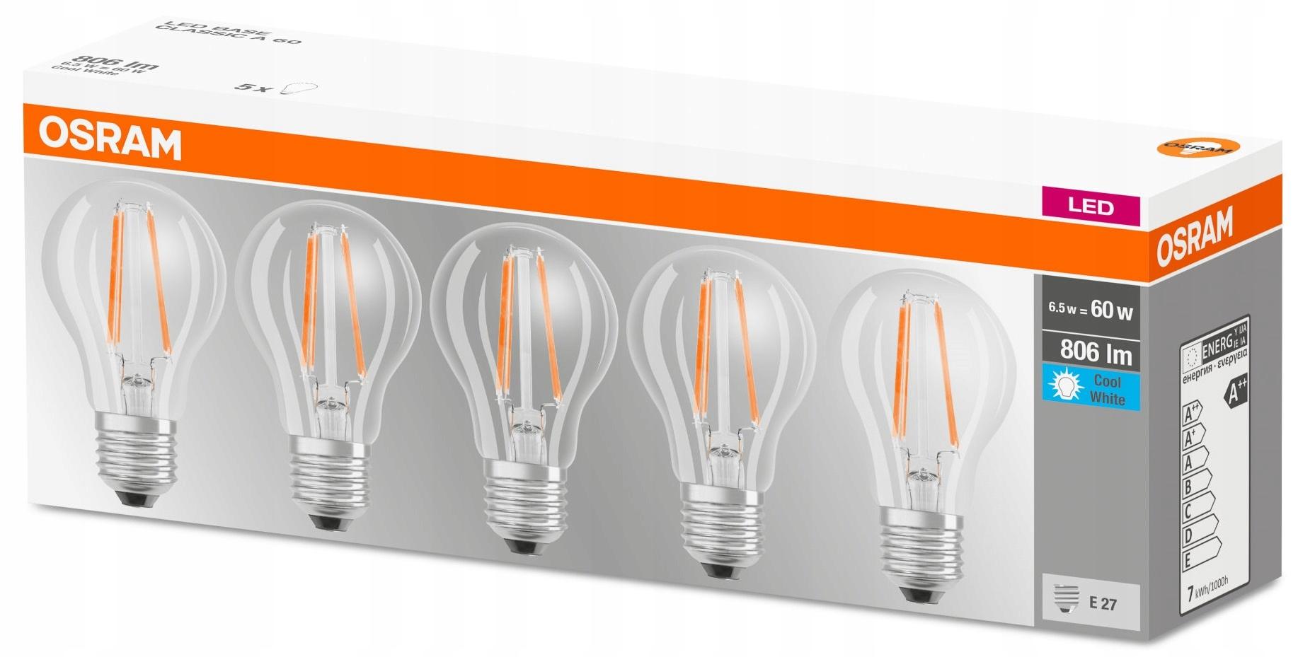 Zestaw 5x żarówka LED Filament E27 6,5W 4000K 806lm Osram