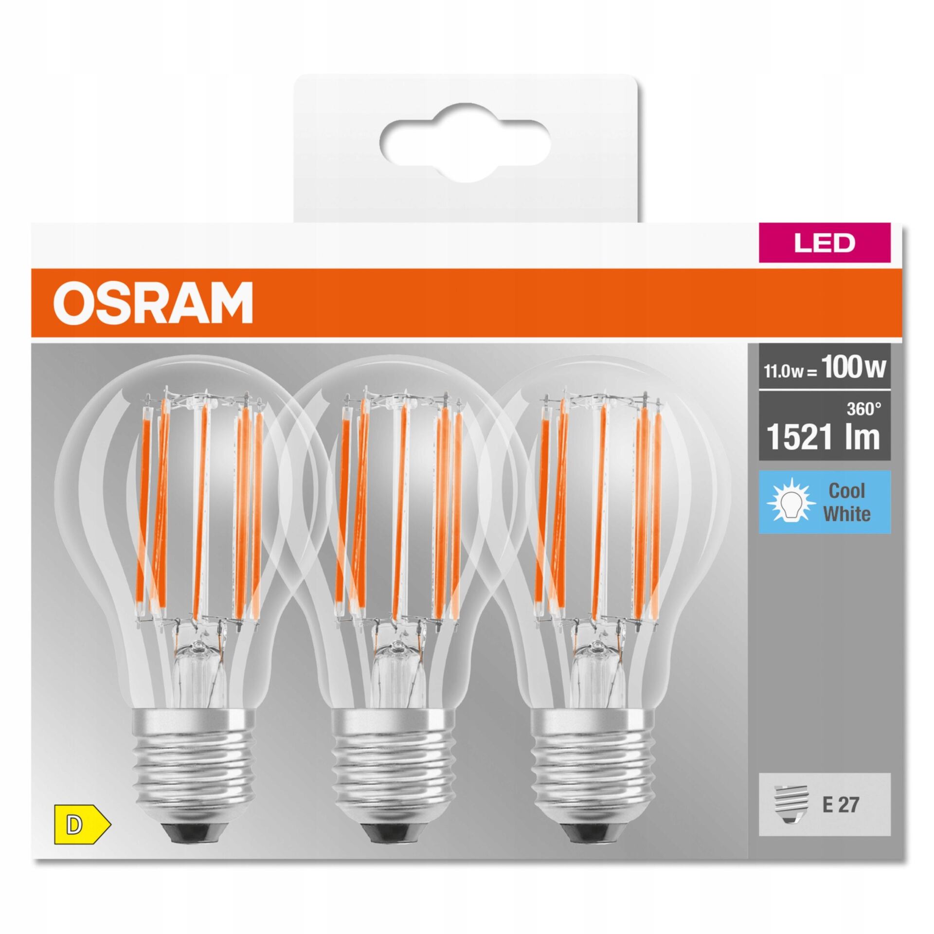 3PAK Żarówka LED E27 A60 11W = 100W 1521lm 4000K Neutralna 300° Filament OSRAM BASE