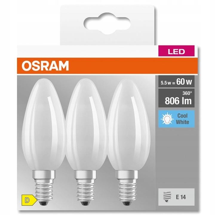 Żarówka LED renomowanej i uznanej w branży oświetleniowej firmy OSRAM z serii BASE z trzonkiem E14 kącie padania światła 300° i mocy wynoszącej 5,5W (odpowiednik klasycznego halogenu o mocy 60W) to wysokiej jakości źródło światła o neutralnej barwie 4000K i strumieniu świetlnym 806lm.