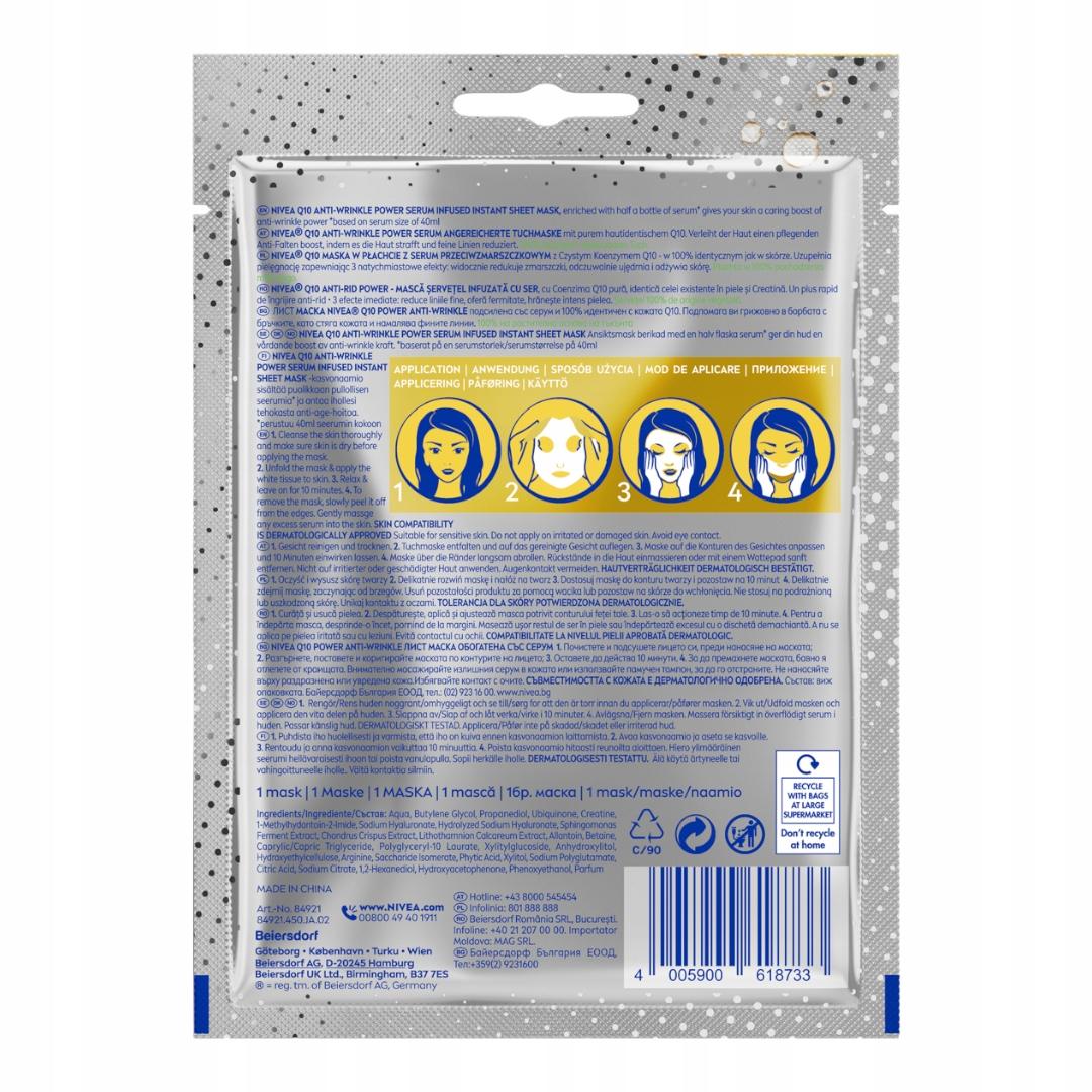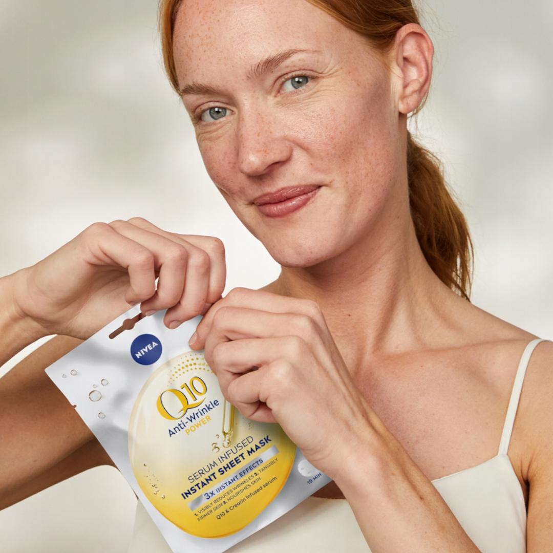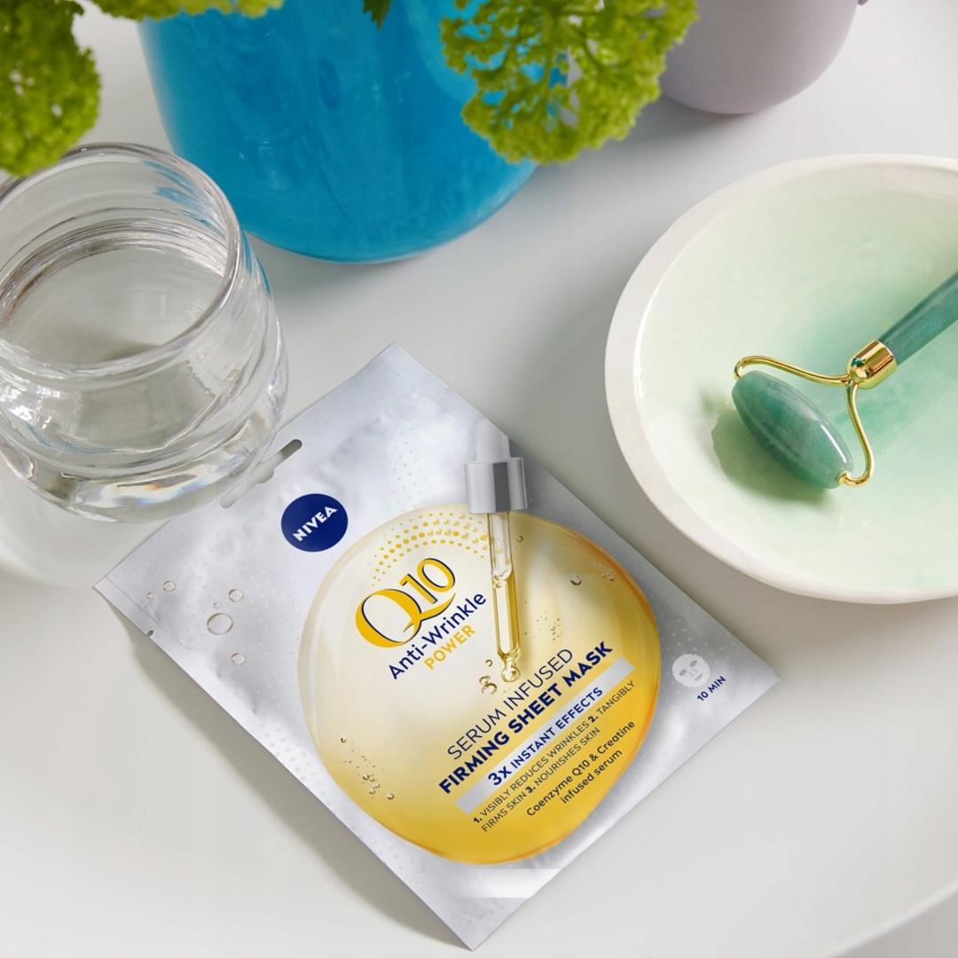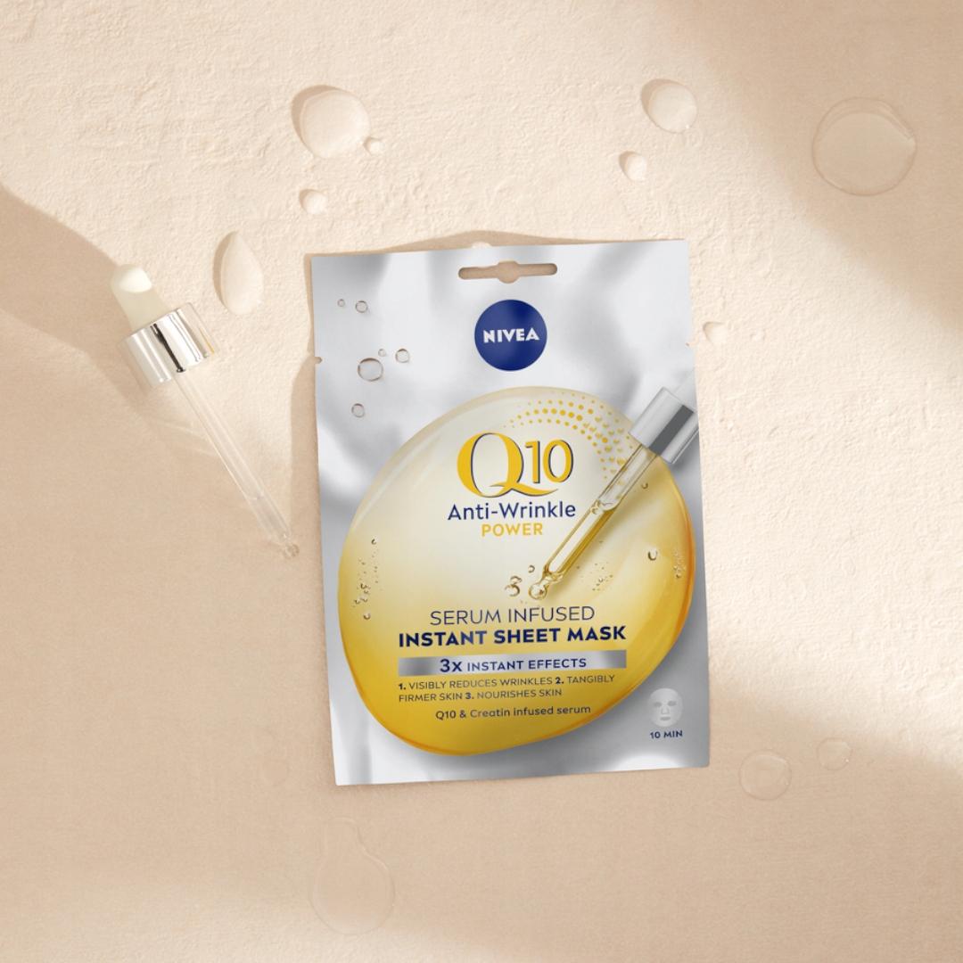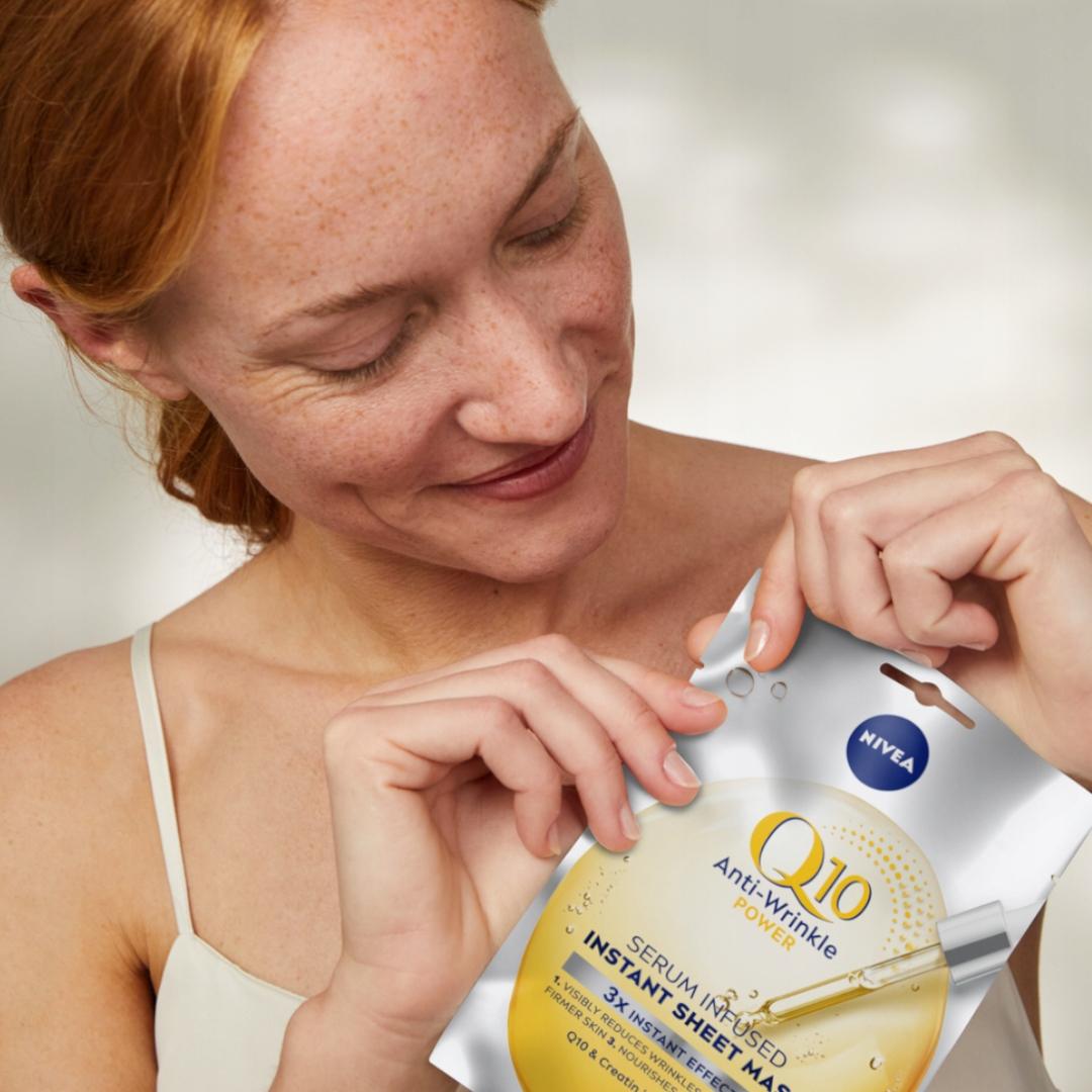Maseczka w płachcie NIVEA Q10 zapewnia skórze pielęgnacyjny zastrzyk przeciwzmarszczkowy. Została wzbogacona czystym Koenzymem Q10 – w 100% identycznym jak w skórze, który chroni skórę przed szkodliwymi czynnikami zewnętrznymi i pomaga w jej lepszej regeneracji. Maska w płachcie uzupełnia pielęgnację zapewniając 3 natychmiastowe efekty: