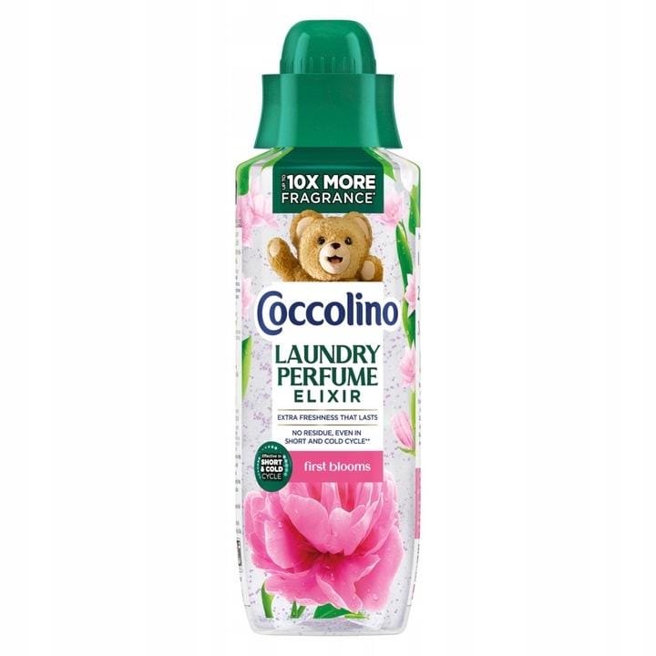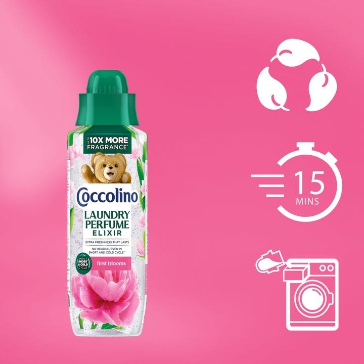 Żel do prania Coccolino Perfume Elixir First Blooms oferuje zapach płatków róż, bergamotki i konwalii, który został wzbogacony naturalnymi olejkami eterycznymi