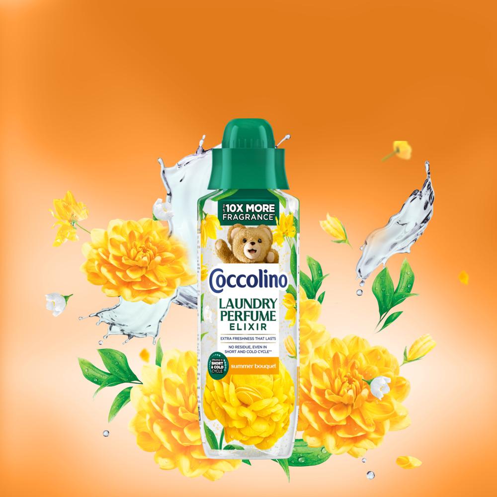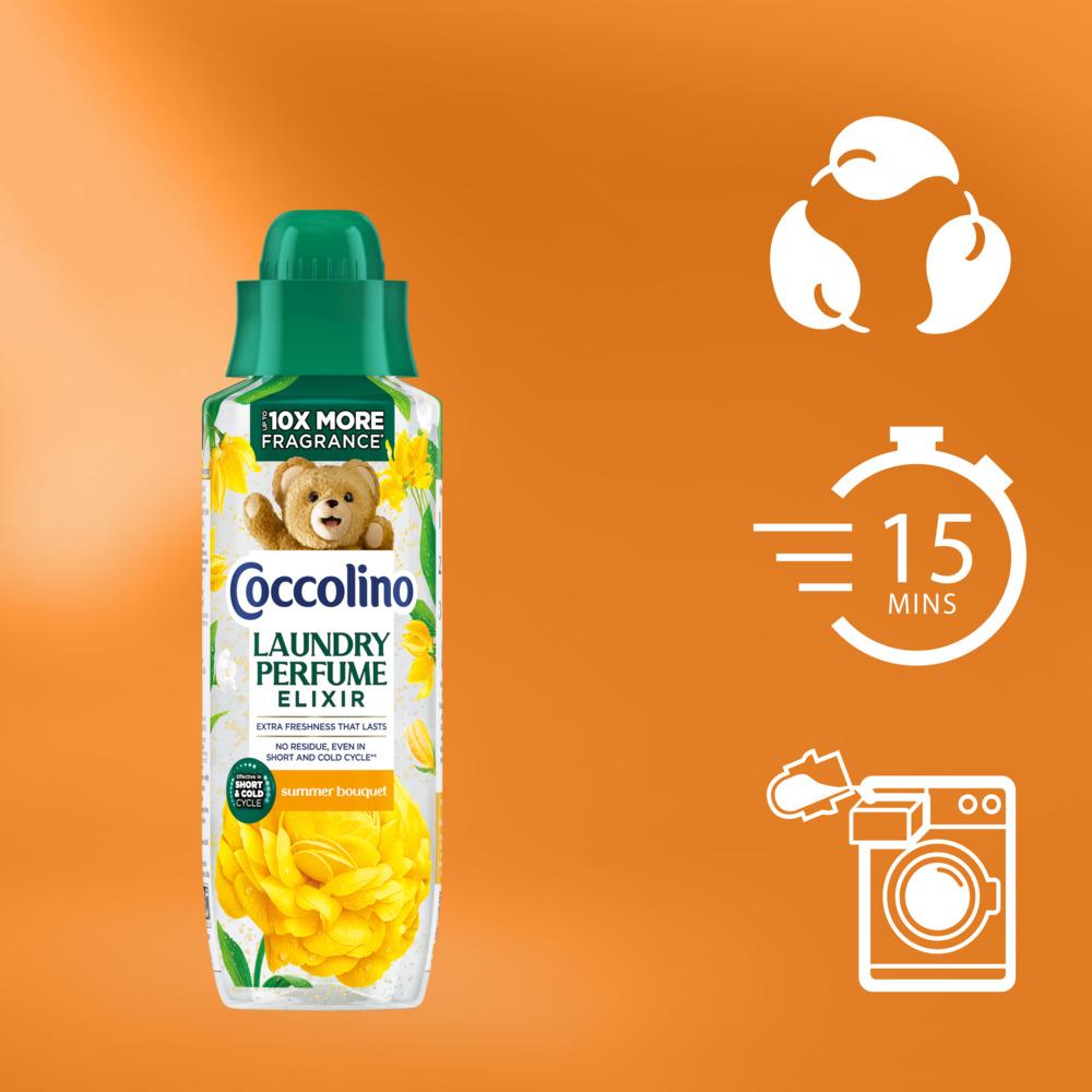 Żel do prania Coccolino Perfume Elixir Summer Bouquet oferuje zapach wiciokrzewu, jaśminu i kwiatu pomarańczy, który został wzbogacony naturalnymi olejkami eterycznymi