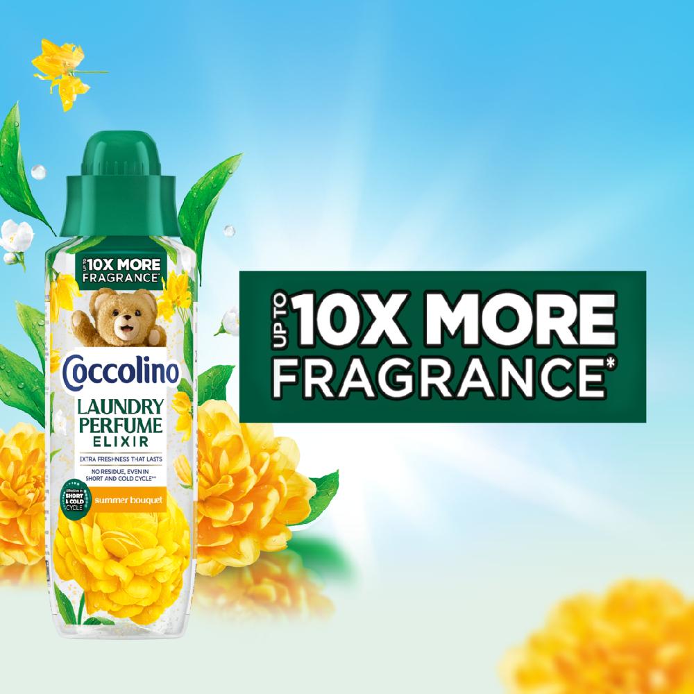 Otul swoje ubrania niezwykłą świeżością, która trwa i trwa! Coccolino Perfume Elixir to nie zwykły płyn do prania, a żelowe perfumy z dodatkiem perełek zapachowych, które pękając w praniu, uwalniają niesamowity zapach. Unikalne zapachy zainspirowane światem piękna, gwarantują długotrwałe doznania sensoryczne i nawet do 10x więcej zapachu w każdym praniu*. Coccolino Perfume Elixir Summer Bouquet zapewni Twojemu praniu wyrafinowany, kwiatowy zapach, dzięki któremu noszenie ulubionych ubrań będzie jeszcze większą przyjemnością. Kompozycja zapachowa, na którą składają się nuty wiciokrzewu, jaśminu i kwiatu pomarańczy, została dodatkowo wzbogacona naturalnymi olejkami eterycznymi. To sprawia, że wyjątkowy zapach będzie utrzymywał się na Twoich ubraniach jeszcze długo po ich wysuszeniu. Dzięki żelowej formule produktu, która jest w 93% biodegradowalna, detergent w pełni rozpuszcza się w wodzie, nawet w szybkich i zimnych cyklach oraz nie pozostawia plam. Pragniesz jeszcze więcej pięknego zapachu na swoich ubraniach? Dla intensywniejszego zapachu używaj Coccolino Perfume Elixir w połączeniu ze swoim ulubionym płynem do płukania Coccolino. Poczuj się jak perfumiarz, łącząc dowolnie nasze produkty i tworząc tym samym nowe, unikalne kompozycje zapachowe, które sprawią Ci wiele przyjemności na co dzień. Sposób użycia: aby pranie pięknie pachniało, dodaj żel Coccolino do ostatniego płukania. *W porównaniu do prania, w którym użyto tylko detergentu do prania.
