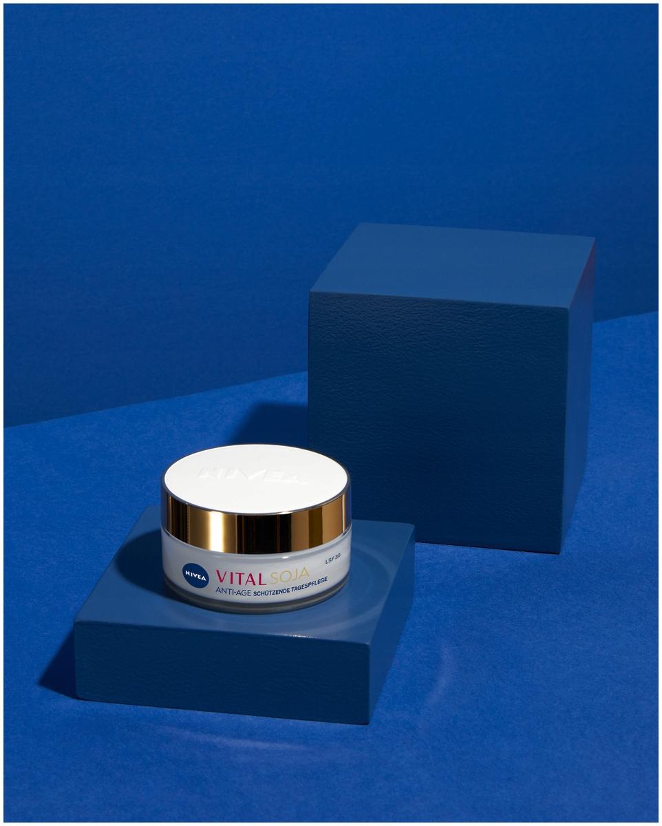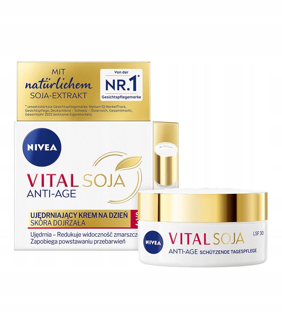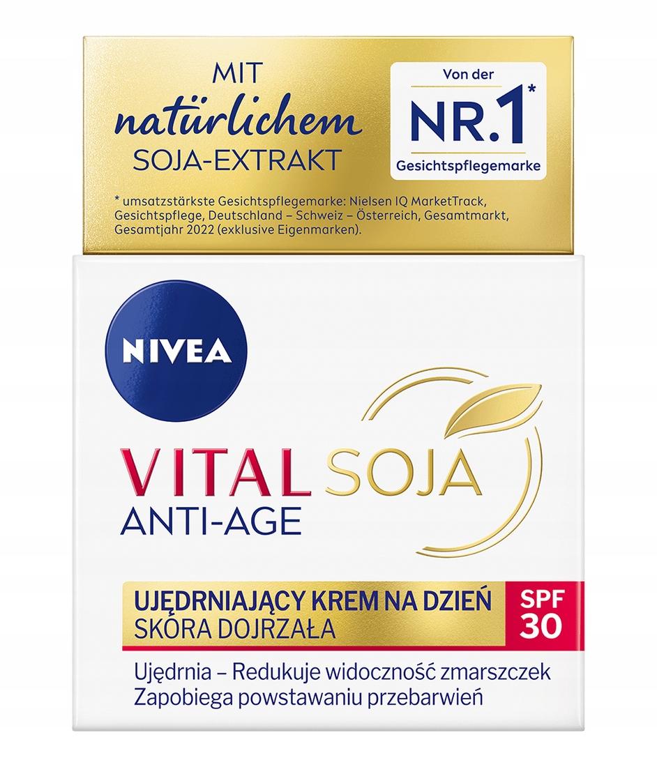 NIVEA VITAL SOJA Ujędrniający krem na dzień dla skóry dojrzałej SPF 30. Jego bogata formuła z naturalnym Ekstraktem z Soi, stosowana regularnie, redukuje główne oznaki starzenia się skóry. Krem wtapia się w skórę zapewniając skórze komfort przez cały dzień. Skutecznie chroni przed szkodliwym działaniem promieni słonecznych UVA/UVB, dzięki posiadaniu filtra SPF 30, dodatkowo zapobiega powstawaniu przebarwień, widocznie ujędrnia skórę i redukuje zmarszczki od wewnątrz, a także natychmiastowo i intensywnie nawilża skórę. Tolerancja dla skóry potwierdzona dermatologicznie. Dla wzmocnienia efektu stosuj też VITAL SOJA Regenerujący krem na noc.