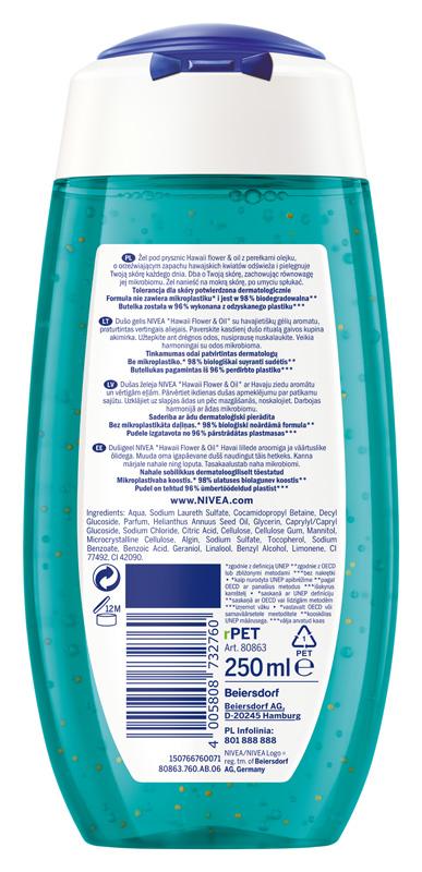 Poczuj się wyjątkowo w swojej miękkiej, świeżej i zadbanej skórze. Zapach hawajskich kwiatów wprawi Cię w błogi stan relaksu, wyciszenia, a Twoja skóra zyska odżywiony, gładki i zdrowy wygląd. Dbając o Twoją skórę, troszczymy się również o środowisko, dlatego formuła naszego żelu nie zawiera mikroplastików* i jest w 98% biodegradowalna, a butelka*** została wykonana w 96% z plastiku pochodzącego z recyklingu. *zgodnie z definicją UNEP ** zgodnie z OECD lub zbliżonymi metodami *** wyłączając nakrętkę Odkryj także inne żele pod prysznic z olejkiem od NIVEA.