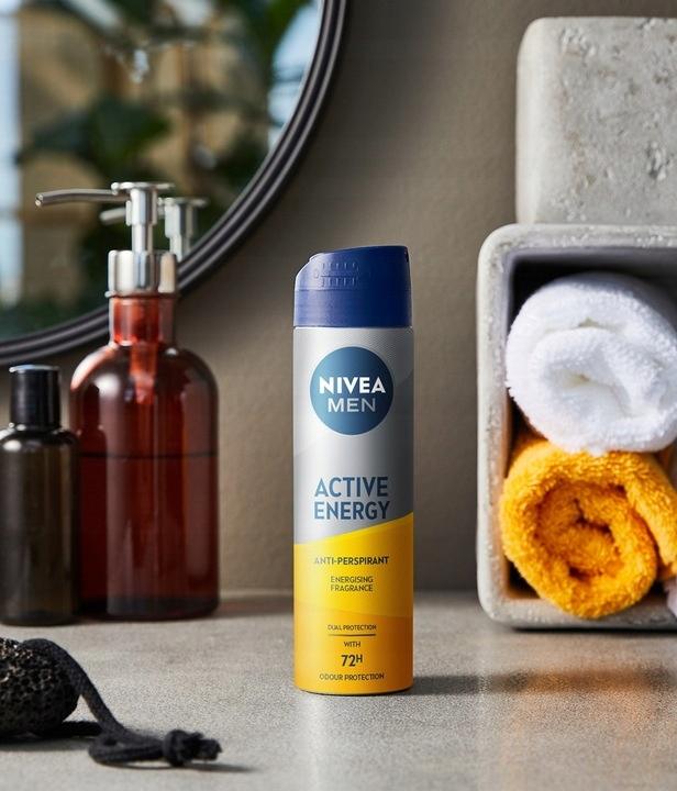 Męski antyperspirant NIVEA MEN Active Energy zapewnia niezawodną ochronę przed wilgocią pod pachami i nieprzyjemnym zapachem potu. Postaw na unikalną formułę z kompleksem cynku i substancjami aktywnymi, która chronią w nawet najbardziej stresujących sytuacjach! Dezodorant zwalcza składniki potu o różnym zapachu, chroniąc Cię przed nieprzyjemnym zapachem ciała przez 48 godzin. Jednocześnie męski antyperspirant NIVEA Active Energy delikatnie pielęgnuje skórę pod pachami. Antyperspirant męski Active Energy zapewnia silną ochronę o energetyzującym i długotrwałym zapachu – to męski zapach o wyjątkowym aromatycznym, drzewnym charakterze, który na długo pozostanie z Tobą. Nuta głowy łączy musujące owoce cytrusowe ze świeżym imbirem, a chłodne kwiatowe i korzenne elementy w środkowej części prowadzą do męskiego i ciepłego drzewnego tła. Poczuj się pewnie z antyperspirantem NIVEA MEN!