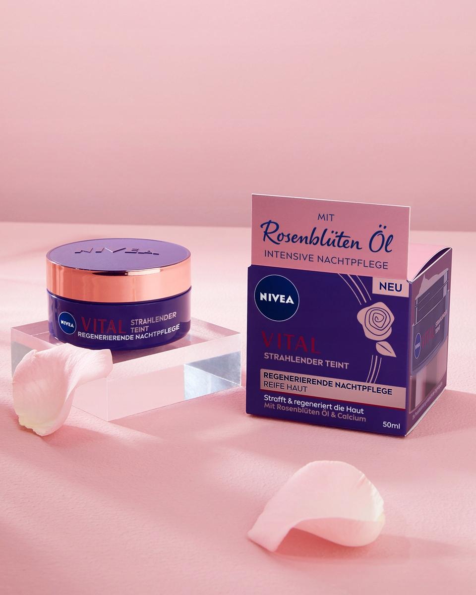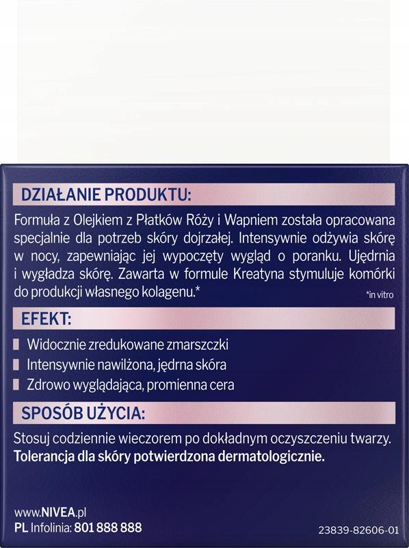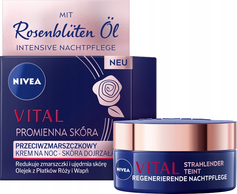NIVEA VITAL PROMIENNA SKÓRA Przeciwzmarszczkowy krem na noc dla skóry dojrzałej. Jego formuła z Olejkiem z Płatków Róży i Wapniem została opracowana specjalnie dla potrzeb skóry dojrzałej. Intensywnie odżywia skórę w nocy, zapewniając jej wypoczęty wygląd o poranku. Ujędrnia i wygładza skórę. Zawarta w formule Kreatyna stymuluje komórki do produkcji własnego kolagenu.* Efekt? Widocznie zredukowane zmarszczki oraz intensywnie nawilżona, jędrna skóra, a także zdrowo wyglądająca, promienna cera. Krem należy stosować codziennie wieczorem, po dokładnym oczyszczeniu twarzy. Omijaj okolice oczu. Tolerancja dla skóry potwierdzona dermatologicznie. *in vitro