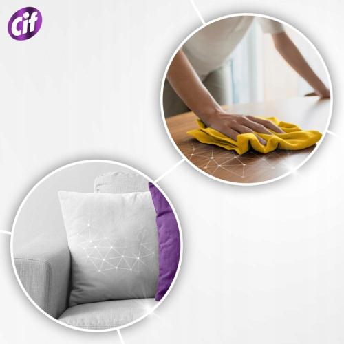 Aby odświeżyć miękkie powierzchnie, takie jak tapicerki, rozpyl niewielką ilość produktu z odległości i pozostaw do wyschnięcia. Jeśli nieskazitelna czystość i kompleksowa pielęgnacja to coś, o co chcesz zadbać w swoim domu, koniecznie wypróbuj także inne produkty marki Cif, takie jak mleczko kuchenne, odtłuszczacz czy odkamieniacz. Zadbaj razem z Cif o czystą i bezpieczną przyszłość!