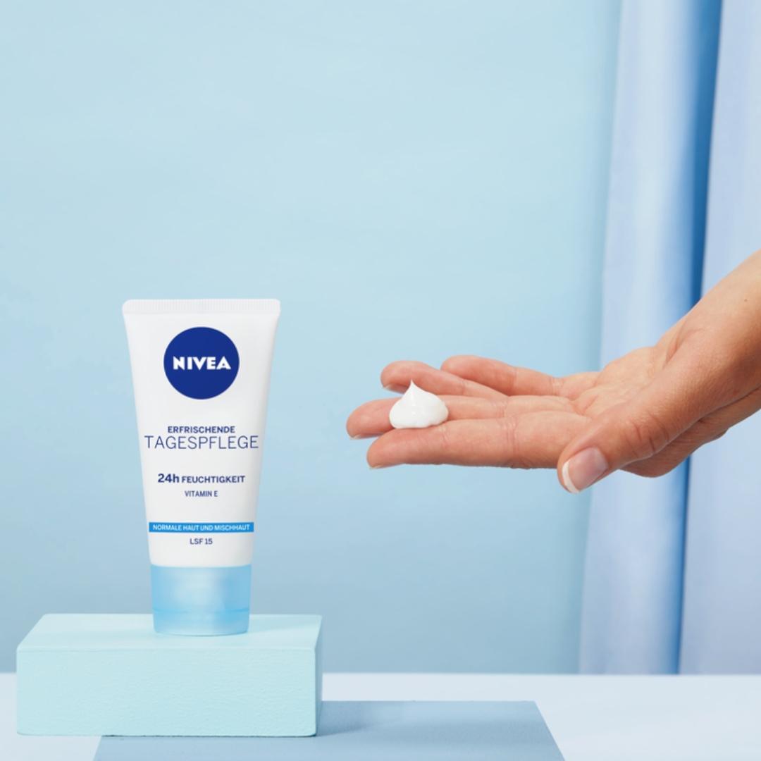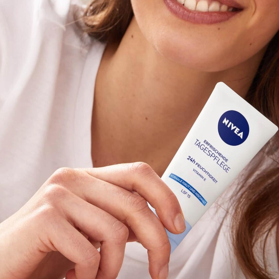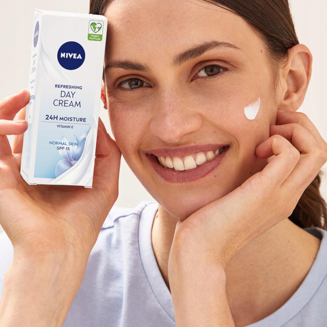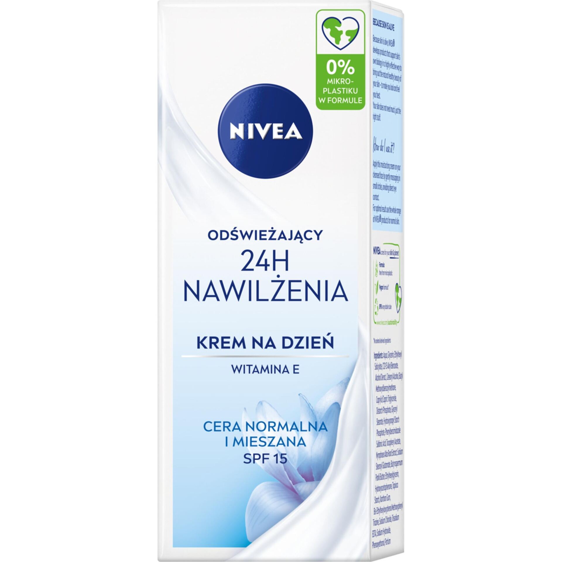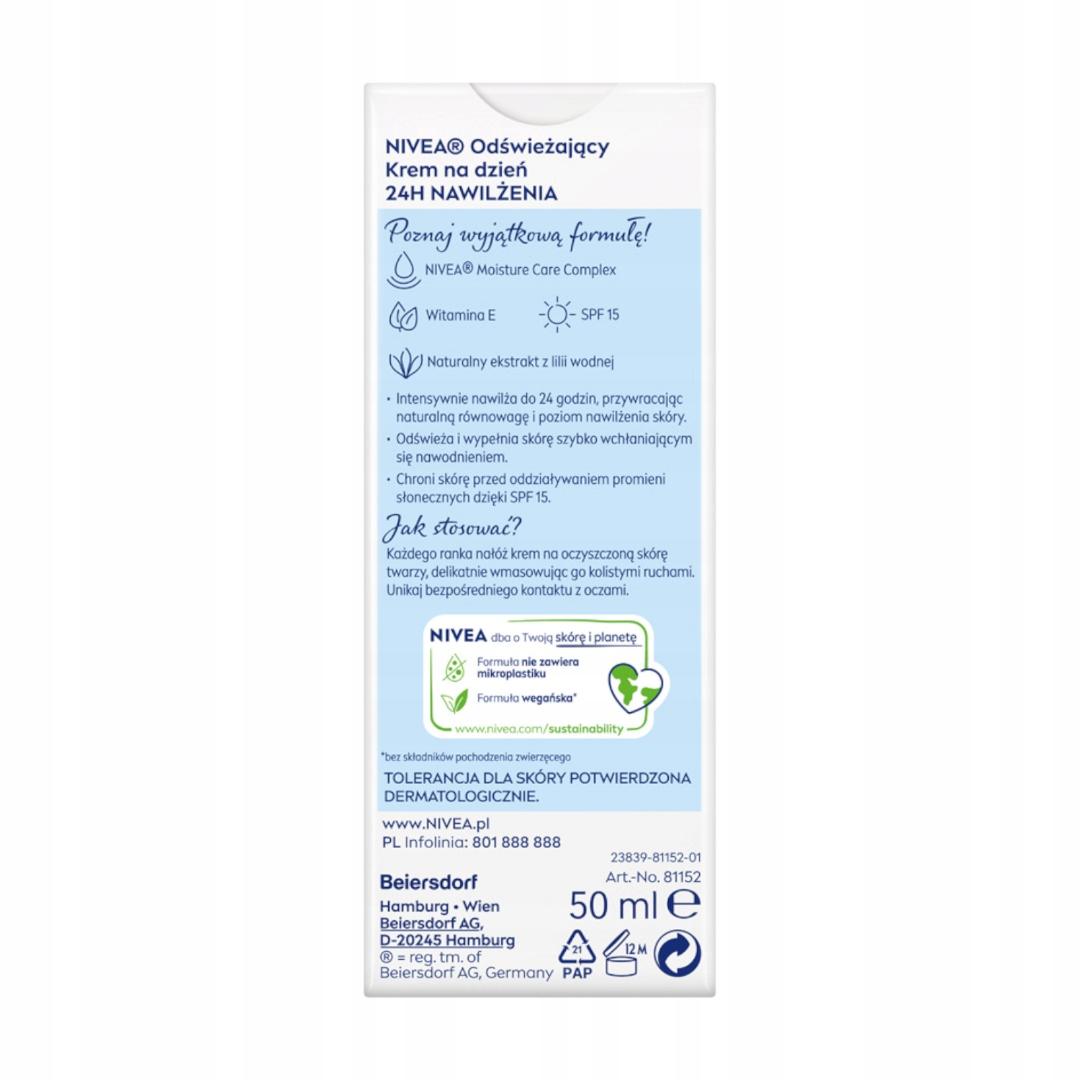 NIVEA Odświeżający Krem na dzień 24H NAWILŻENIA odpowiedni na cery normalnej i mieszanej ma wyjątkową formułę zawierającą NIVEA Moisture Care Complex, Witaminę E, Naturaly ekstrakt z lilii wodnej oraz filtr SPF15. Krem intensywnie nawilża do 24 godzin, przywracając naturalną równowagę i poziom nawilżenia skóry, odświeża i wypełnia skórę szybko wchłaniającym się nawodnieniem oraz chroni skórę przed oddziaływaniem promieni słonecznych dzięki SPF15. NIVEA dba o Twoją skórę i planetę, dlatego formuła nie zawiera mikroplastiku i jest wegańska – bez składników pochodzenia zwierzęcego. Tolerancja dla skóry potwierdzona dermatologicznie. Unikaj bezpośredniego kontaktu z oczami.