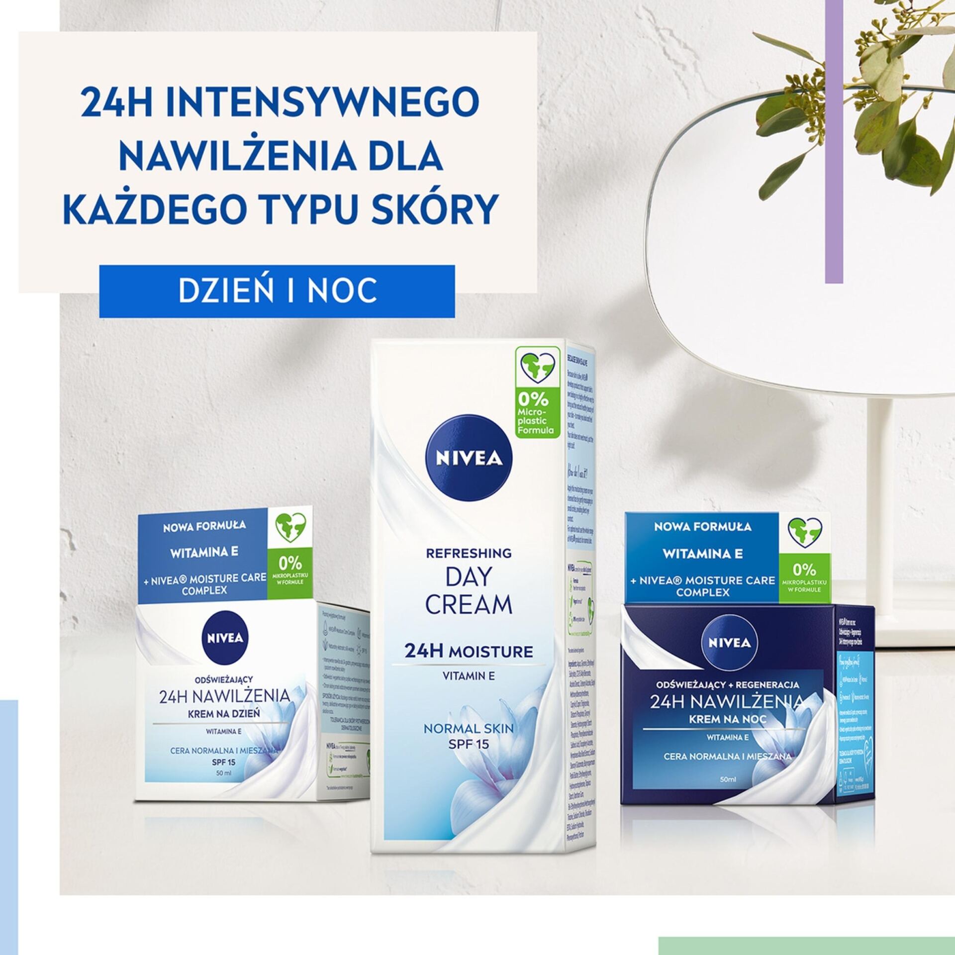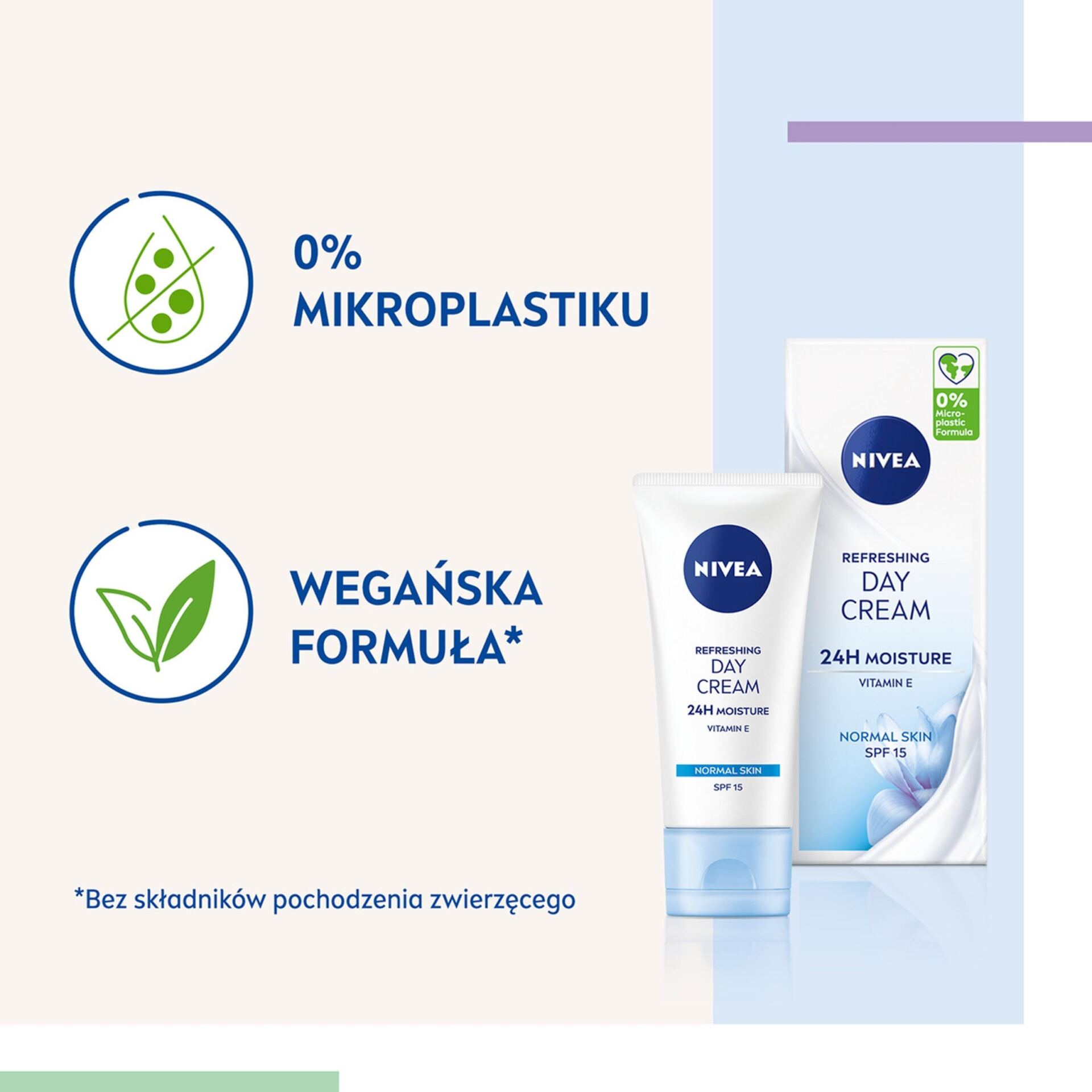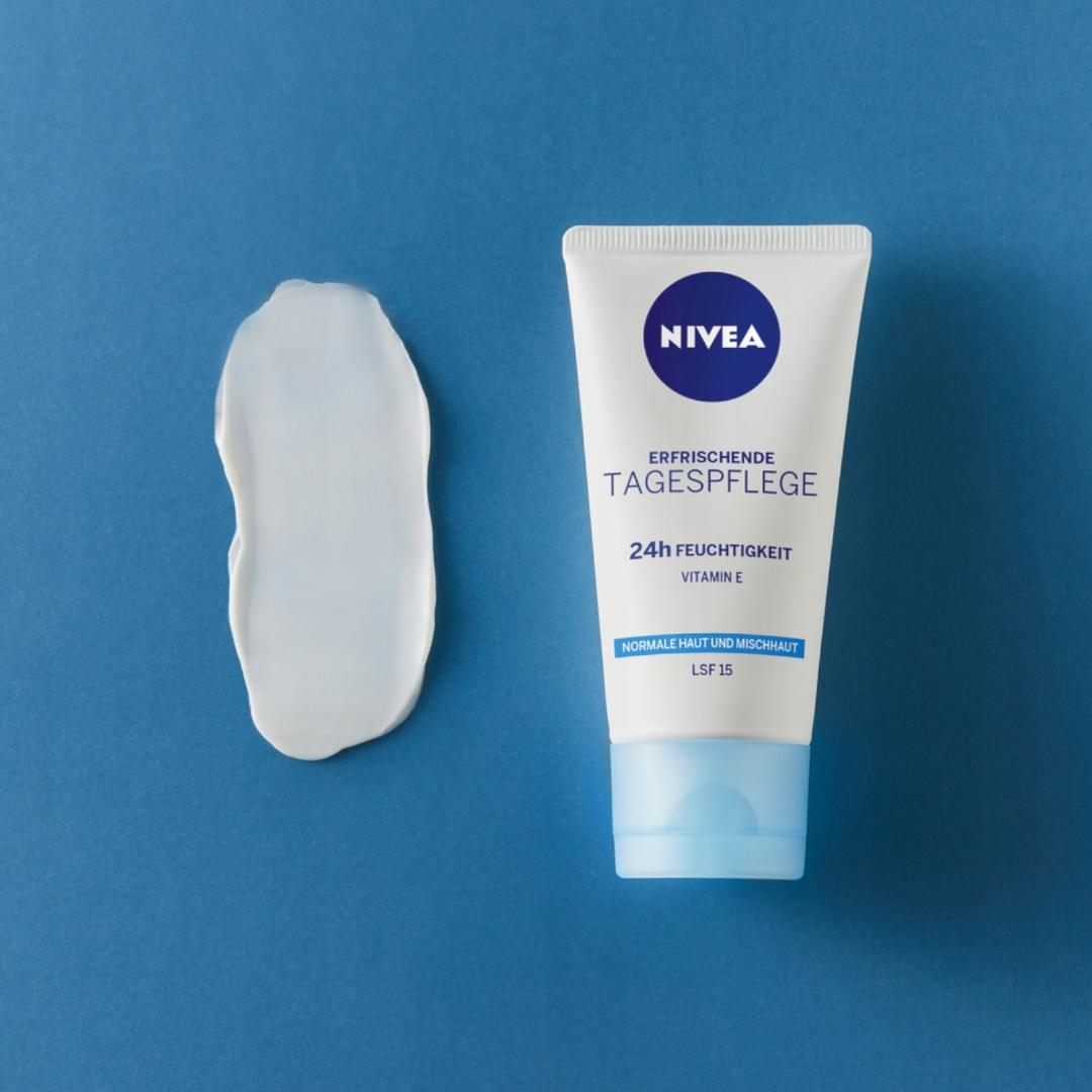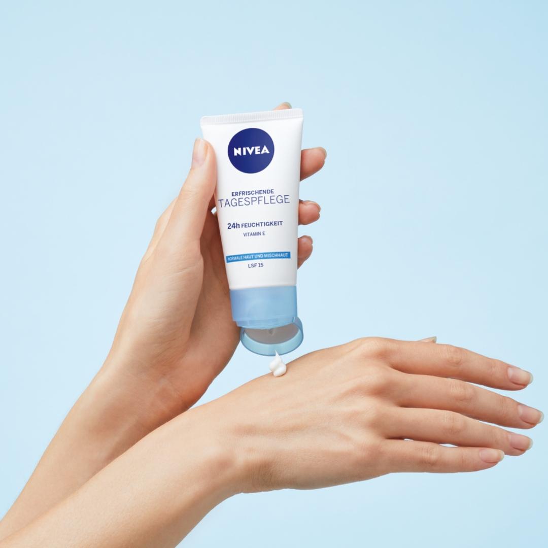 NIVEA Odświeżający Krem na dzień 24H NAWILŻENIA odpowiedni na cery normalnej i mieszanej ma wyjątkową formułę zawierającą NIVEA Moisture Care Complex, Witaminę E, Naturaly ekstrakt z lilii wodnej oraz filtr SPF15. Krem intensywnie nawilża do 24 godzin, przywracając naturalną równowagę i poziom nawilżenia skóry, odświeża i wypełnia skórę szybko wchłaniającym się nawodnieniem oraz chroni skórę przed oddziaływaniem promieni słonecznych dzięki SPF15. NIVEA dba o Twoją skórę i planetę, dlatego formuła nie zawiera mikroplastiku i jest wegańska – bez składników pochodzenia zwierzęcego. Tolerancja dla skóry potwierdzona dermatologicznie. Unikaj bezpośredniego kontaktu z oczami.