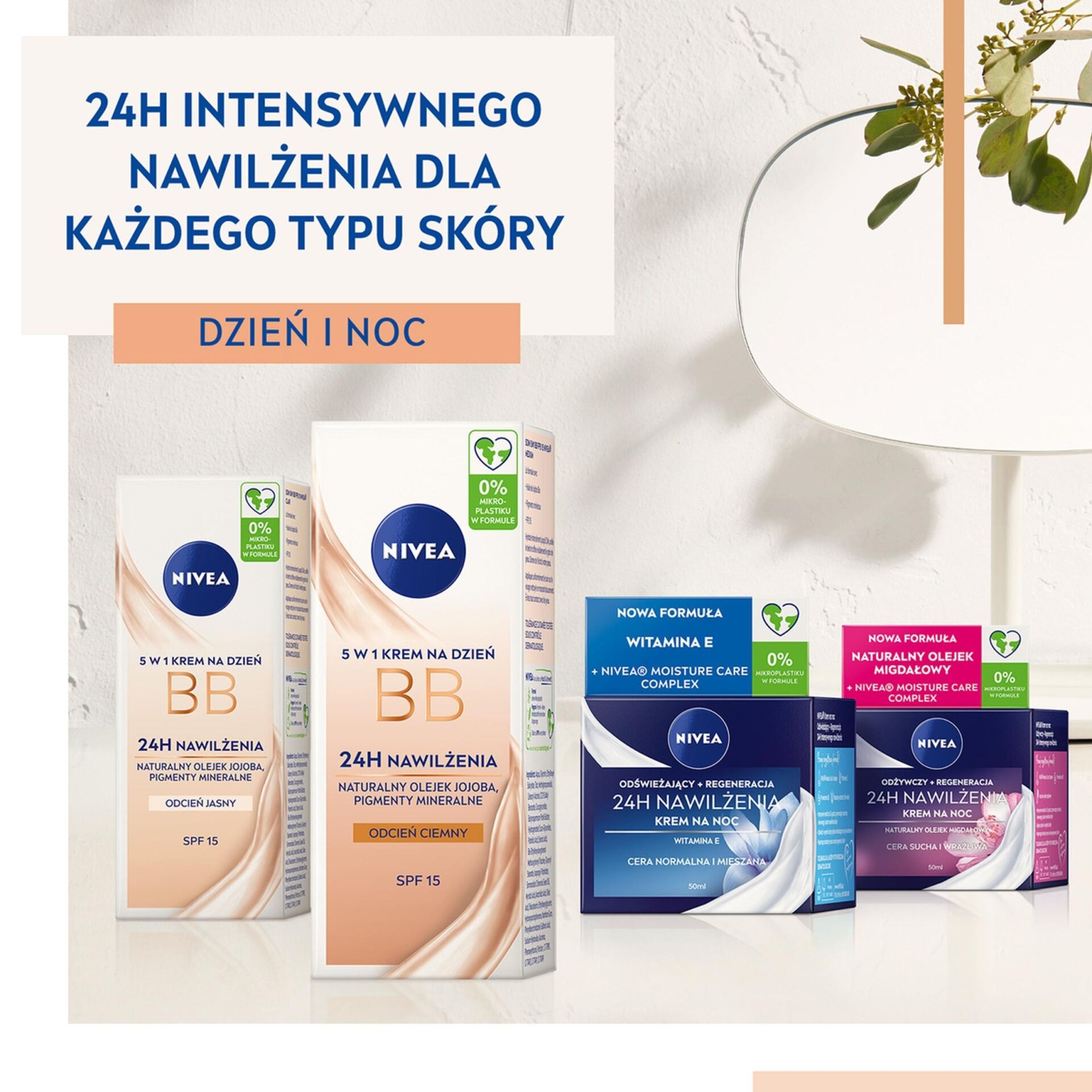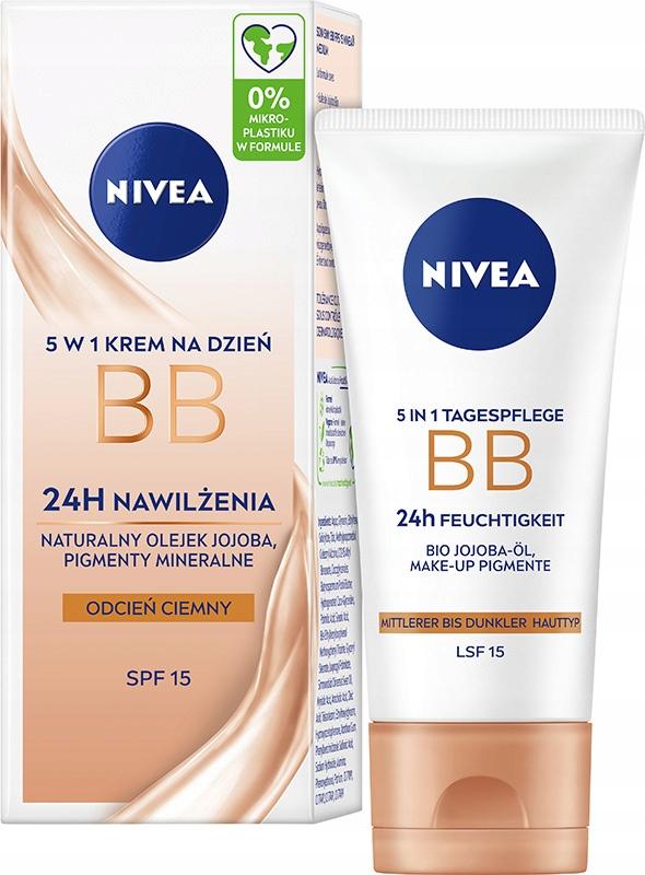 NIVEA Krem BB 5 w 1 na dzień z naturalnym Olejkiem Jojoba i mineralnymi pigmentami intensywnie nawilża skórę do 24 godzin. Koloryzujący krem na dzień do jasnej karnacji zakrywa niedoskonałości, takie jak wypryski, oznaki zmęczenia, cienie pod oczami, przebarwienia, zaczerwienienia i drobne zmarszczki. Wyrównuje koloryt skóry i zmniejsza widoczność porów. SPF 15 zapewnia ochronę przed niekorzystnym działaniem promieni słonecznych. Rozświetla cerę, podkreślając jej naturalny koloryt ! Zgodność kremu BB ze skórą została potwierdzona dermatologicznie.