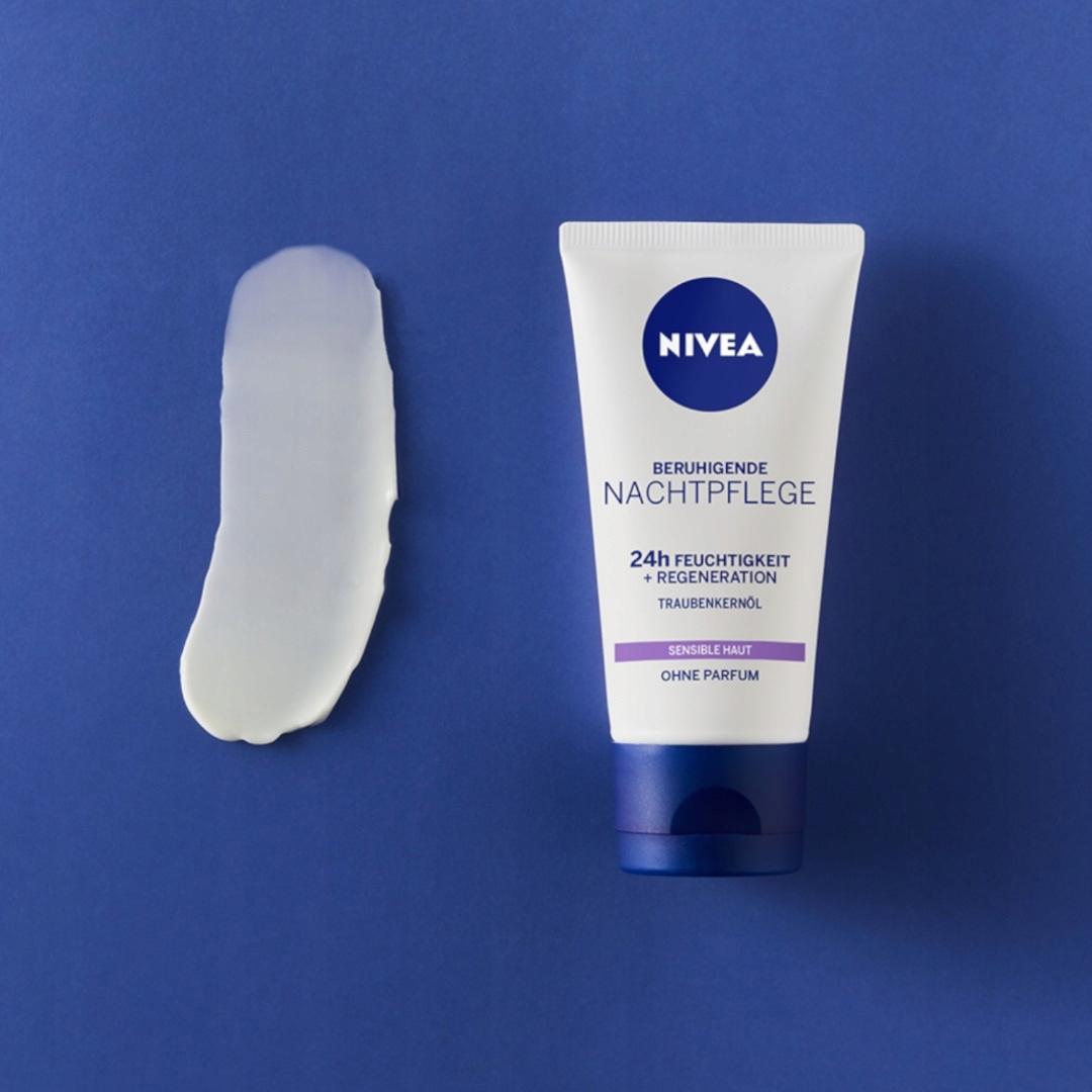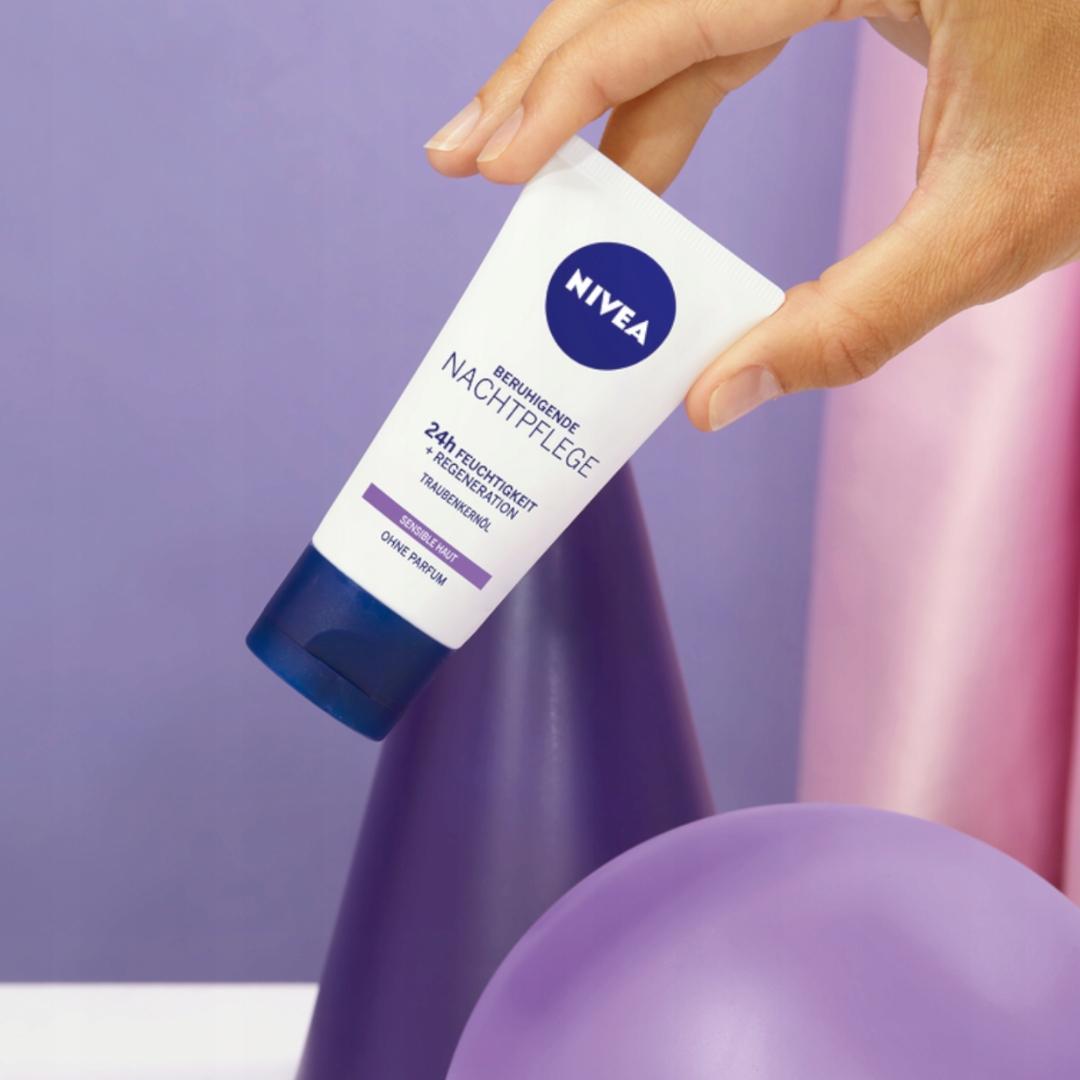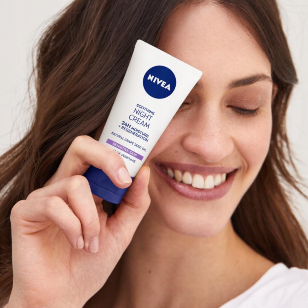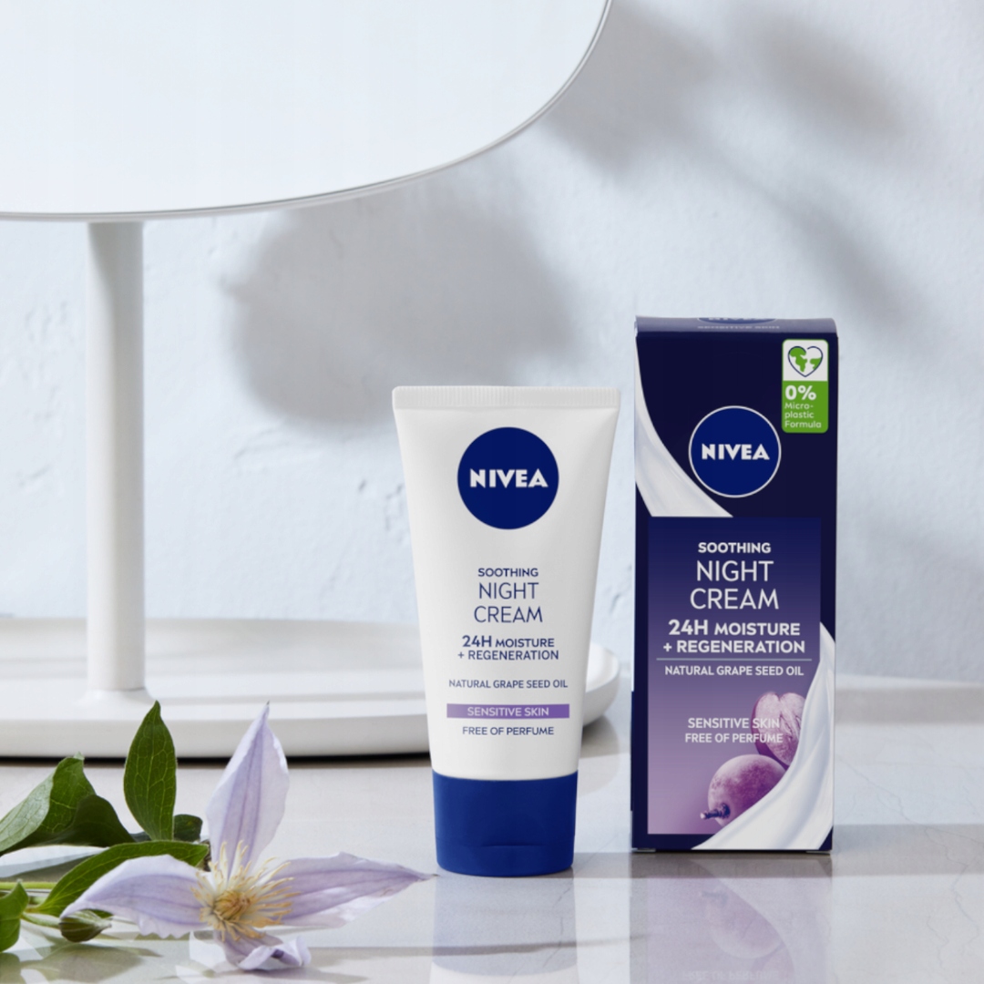Łagodzący krem na noc NIVEA został opracowany z myślą o wrażliwej skórze. Poznaj wyjątkową formułę z olejkiem z pestek winogron, ekstraktem z lukrecji i prowitaminą B5, która intensywnie nawilża do 24 godzin, przywracając naturalną równowagę i poziom nawilżenia skóry, dzięki czemu wspomaga nocny proces regeneracji.