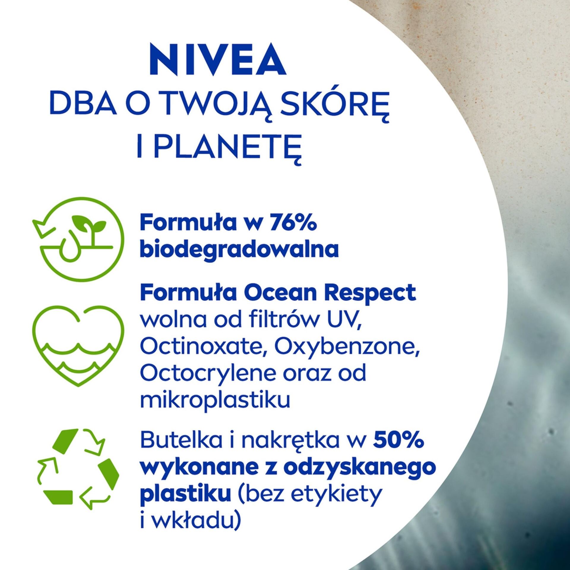 ● Zrównoważony rozwój – formuła jest w 76% biodegradowalna i jest łagodna dla oceanów, ponieważ nie zawiera filtrów UV Octinoxate, Oxybenzone i Octocrylene oraz mikroplastiku. Butelka i nakrętka są wykonane w 50% z plastiku pochodzącego z recyklingu (bez etykiety i wkładki). Kartonik posiada certyfikat FSC.