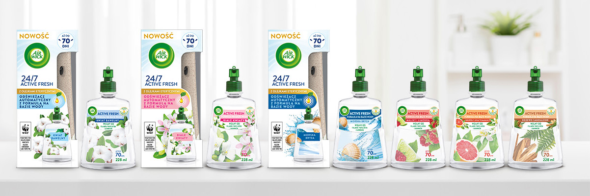 Poznaj nasz pierwszy automatyczny odświeżacz powietrza z formułą na bazie wody, który dzięki użyciu unikalnym cząsteczkom, skutecznie neutralizuje brzydkie zapachy przez cały dzień. Air Wick 24/7 ACTIVE FRESH wypełni Twój dom zapachem aż do 70 dni.