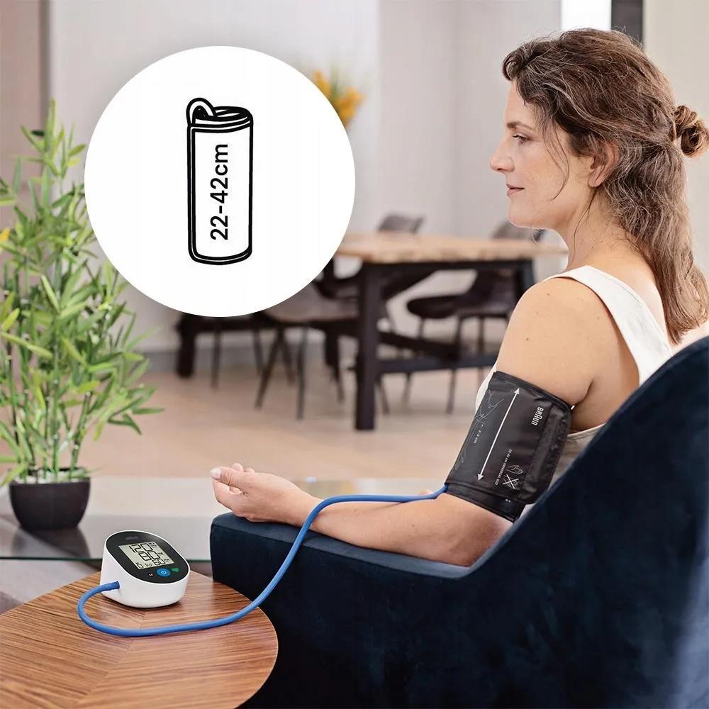 Mankiet do pomiaru ciśnienia krwi, dołączony do ciśnieniomierza Braun ExactFit™ 2, został zaprojektowany tak, aby pasował na ramiona o obwodzie 22-42 cm, zapewniając wygodę niezależnie od budowy ciała.