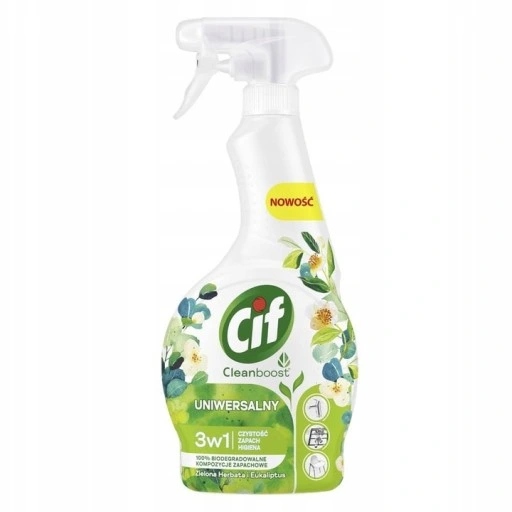 Odkryj magiczną moc czystości z uniwersalnym sprayem Cif CleanBoost 3w1 Zielona Herbata i Eukaliptus!