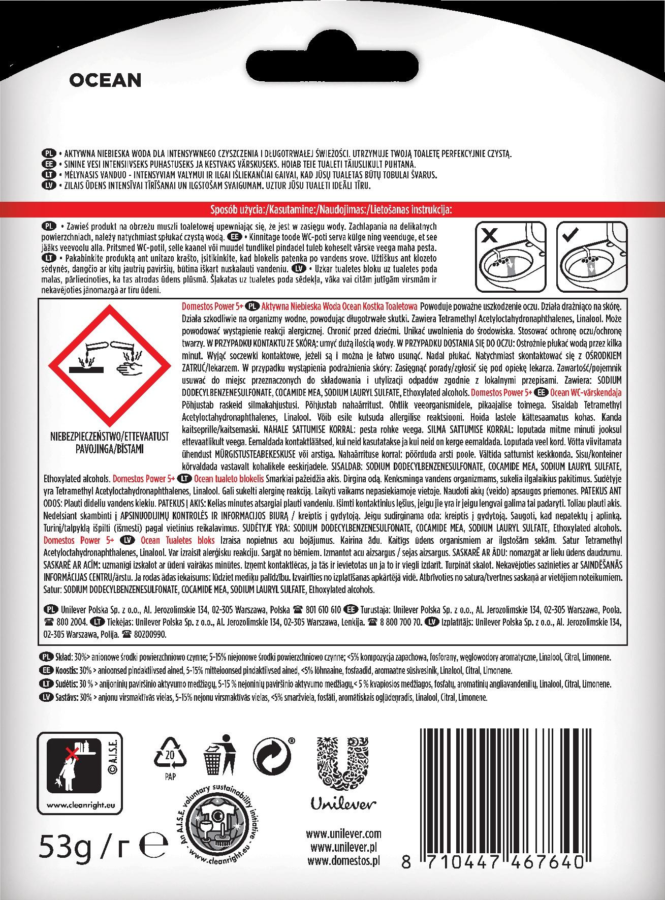 Kostka toaletowa Domestos Power 5 to kompleksowy produkt, który zapewni Twojej toalecie bezpieczeństwo i czystość: higienę, ochrona przed kamieniem, pianę, świeżość i połysk. Czy można oczekiwać czegoś więcej od kostki toaletowej?