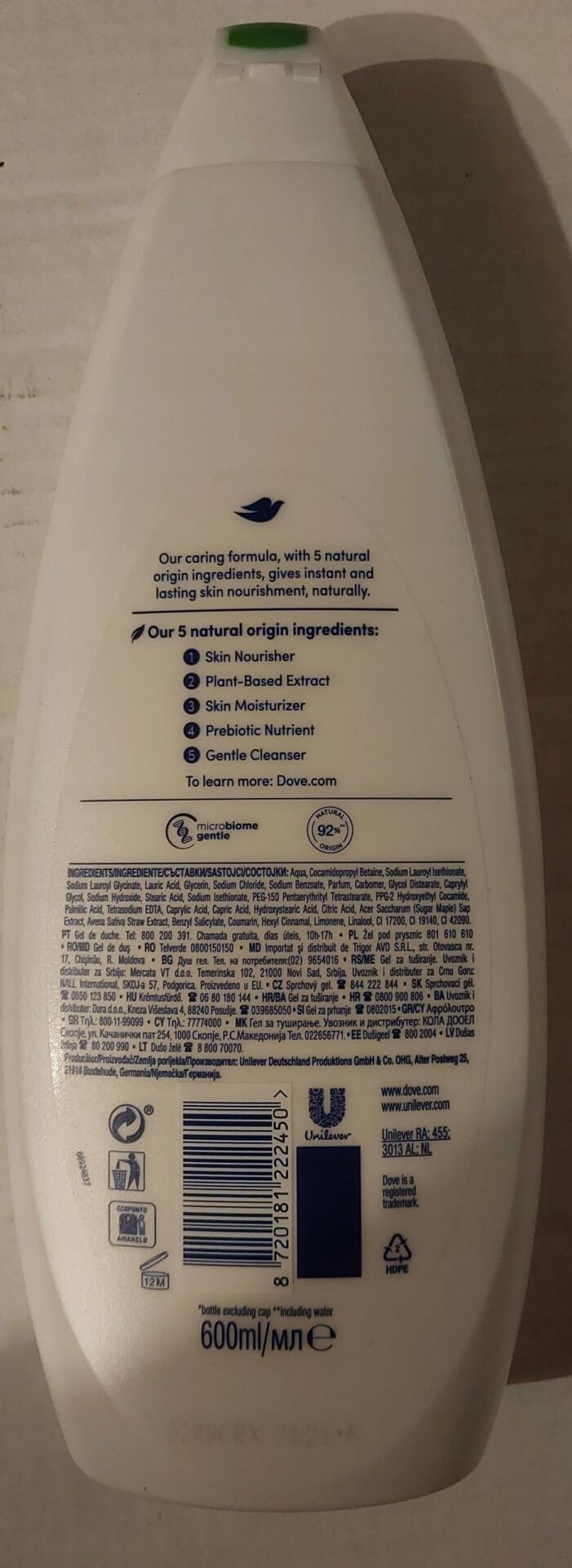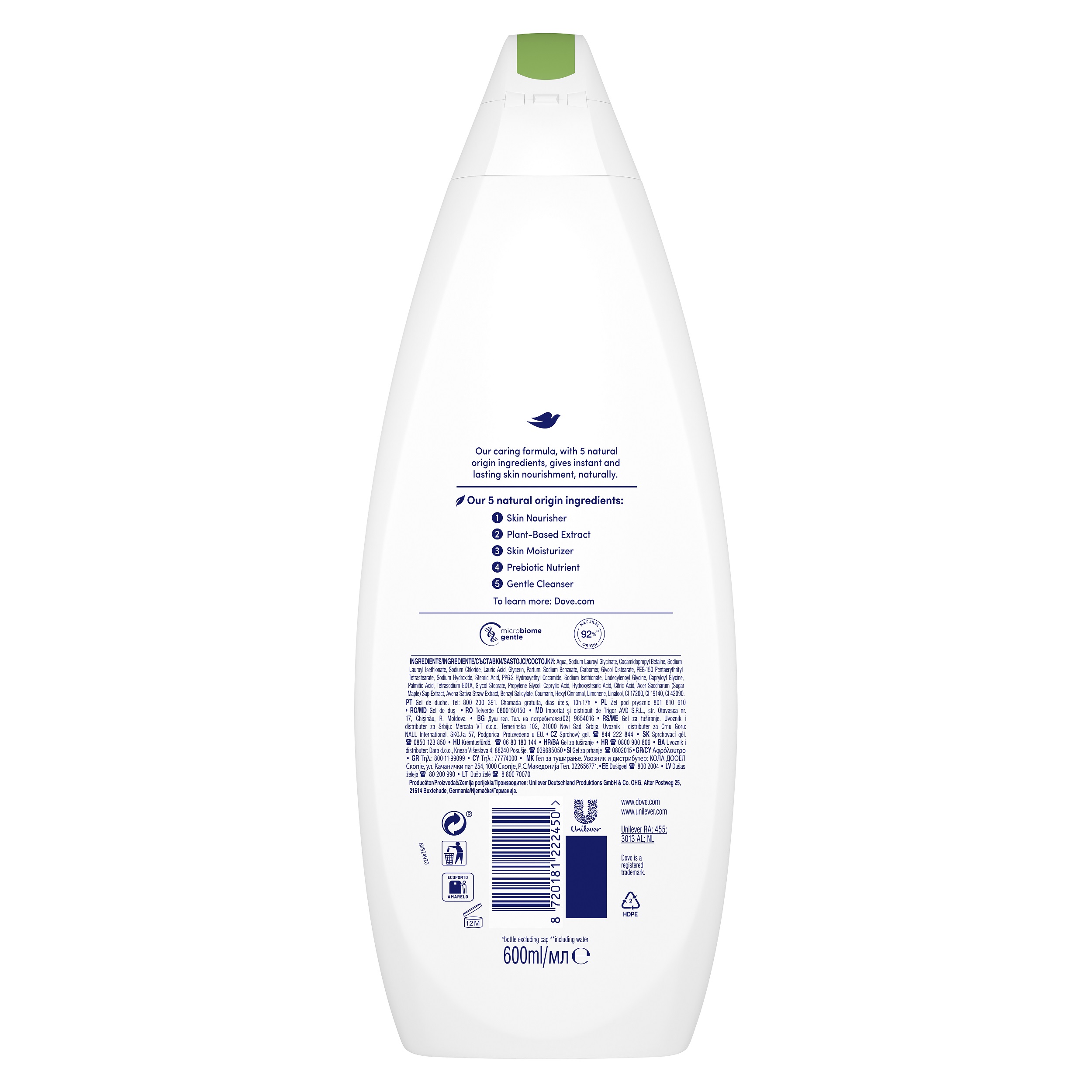 Formuła zawiera w 100% delikatne składniki myjące pochodzenia naturalnego. Ponadto formuła żelu Dove Care by Nature jest w 92% naturalnego pochodzenia a 100% składników nawilżających jest pochodzenia roślinnego. Nowe żele Dove to połączenie pielęgnacji i natury. Dove Care by Nature nie zawiera siarczanów SLES/SLS i jest odpowiedni dla wszystkich rodzajów skóry. Co więcej, formuła jest w 92% biodegradowalna* i jest zapakowana w nadającą się do recyklingu butelkę, wykonaną w 100% z przetworzonego plastiku.*