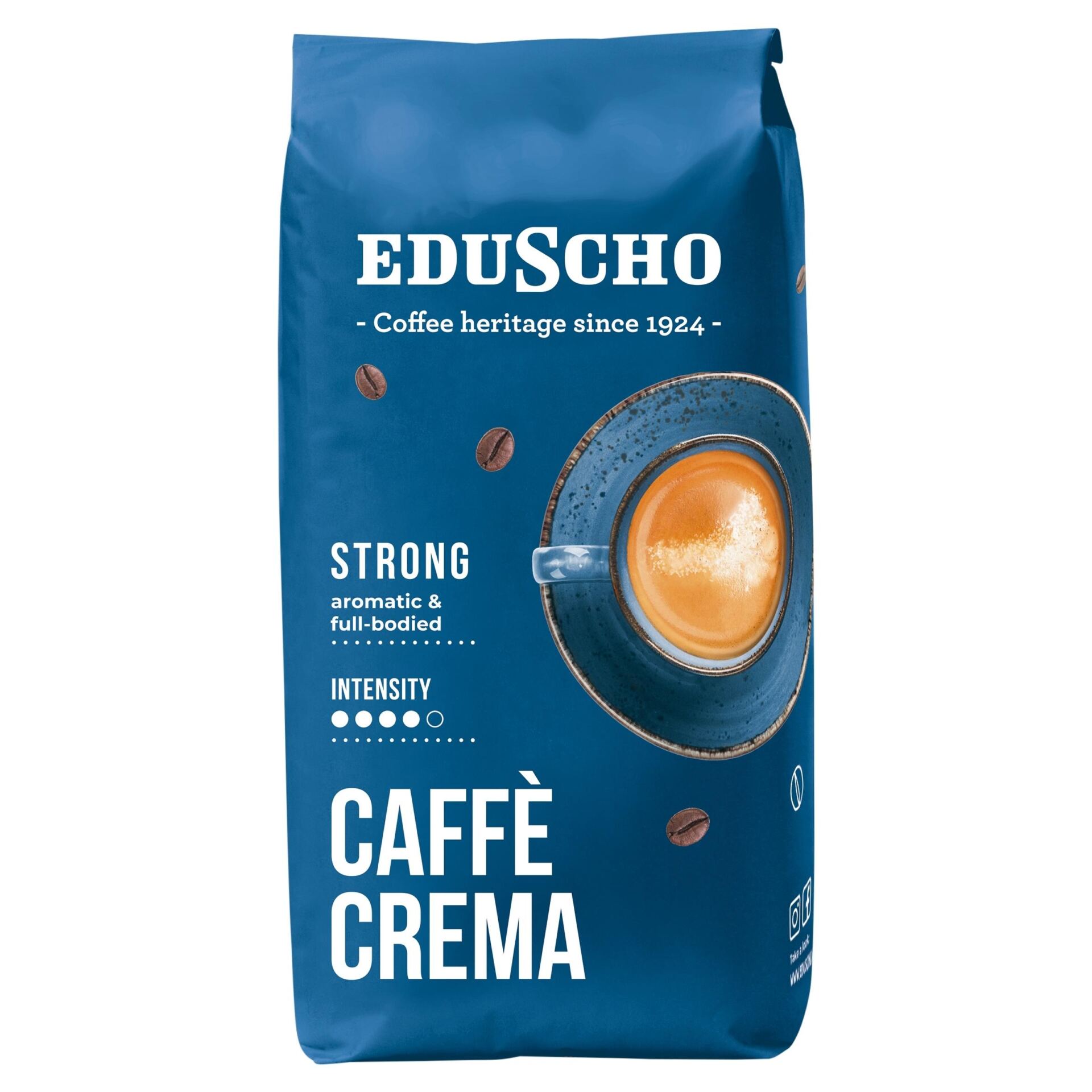 Kawa ziarnista Eduscho Caffè Crema Strong to mieszanka 35% szlachetnej Arabiki z Ameryki Południowej i 65% mocnej Robusty z Azji Południowej, która świetnie sprawdzi się w ekspresie ciśnieniowym. Caffè Crema Strong to śrdnio/mocno palone ziarna idealnie podkreślające charakterystyczne cechy obu typów ziaren.