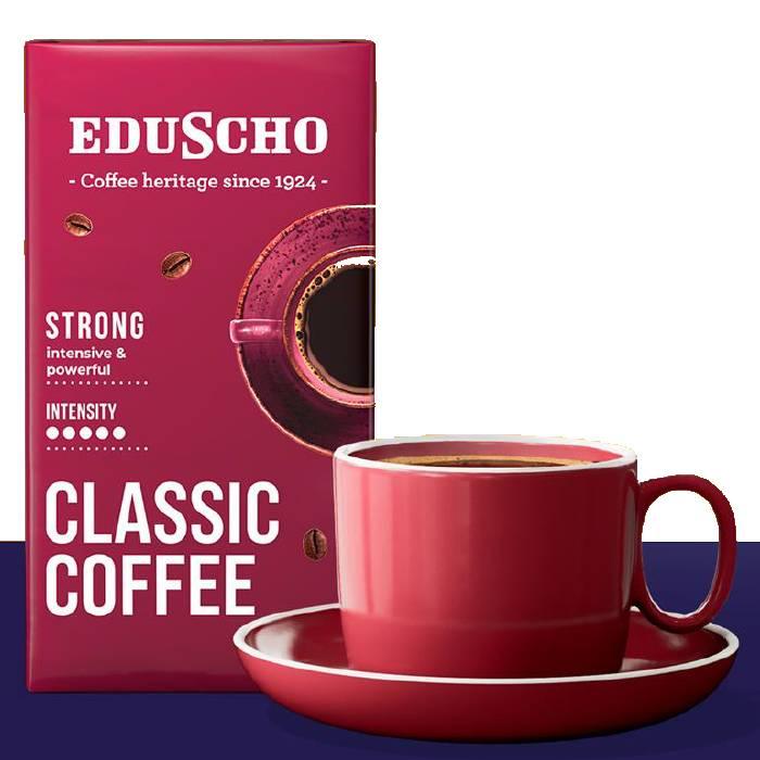 Eduscho Classic Strong. Lubisz mocną, intensywną w smaku kawę? Jeśli tak, Classic Coffee Strong to napój idealny dla Ciebie! Z pomocą starannie wyselekcjonowanych i mocno palonej Robusty, z energią stawisz czoła każdemu dniu. Do dzieła!