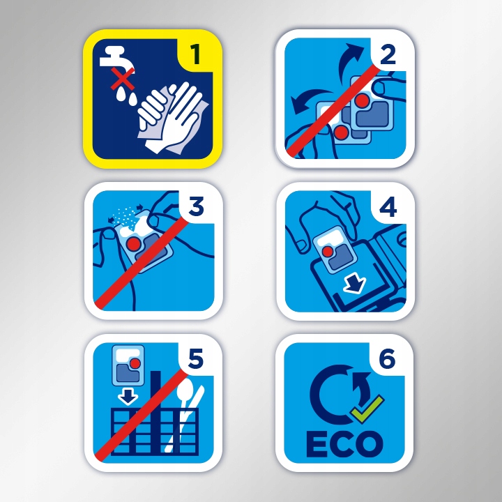 - Rozpuszcza się całkowicie podczas mycia. Do każdego zmywania umieść jedną kapsułkę w SUCHYM dozowniku.