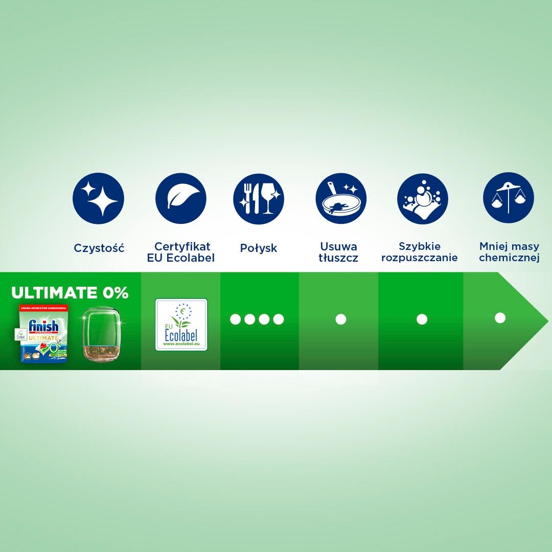 Kapsułki Finish Ultimate 0% nie zawierają kompozycji zapachowej, środków przeciwpieniących ani celowo dodanych konserwantów. Ekologiczne kapsułki dokładnie zwalczają nawet uporczywe resztki jedzenia. Mają funkcję płukania wstępnego.