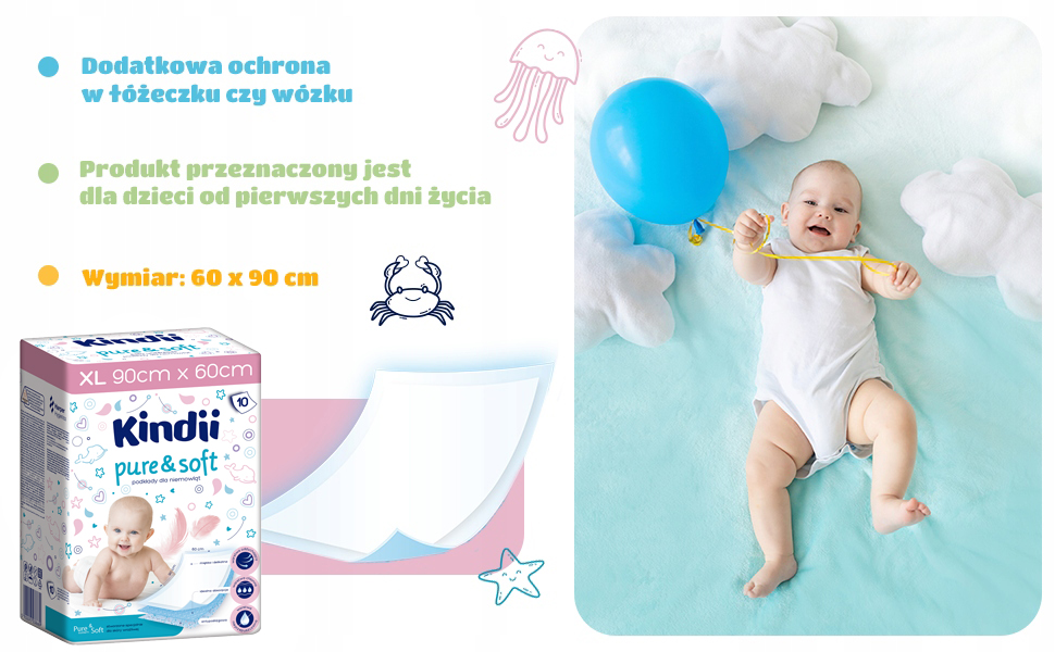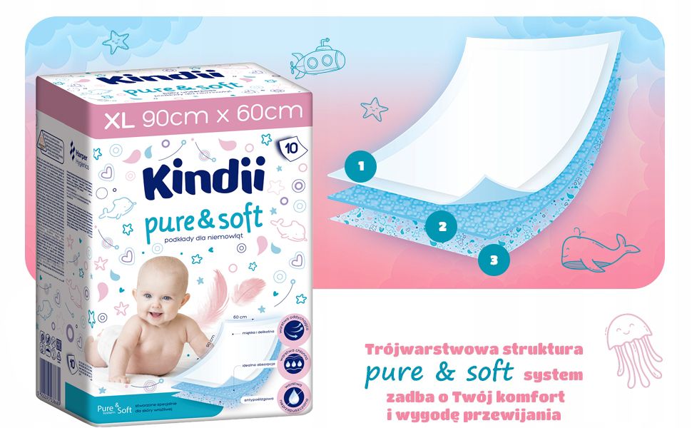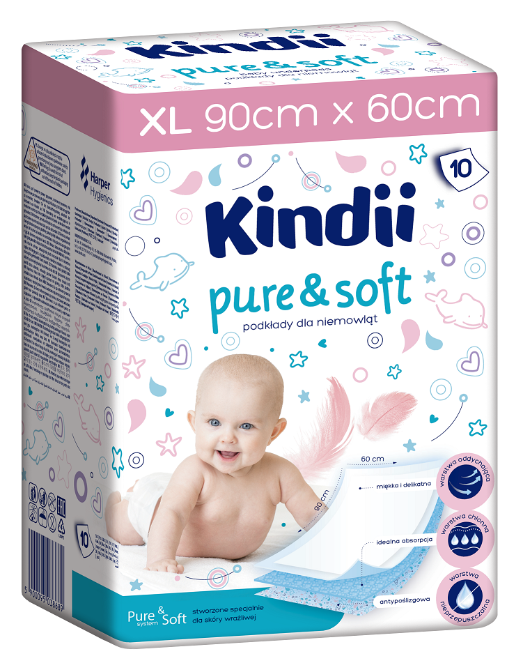 Podkłady Kindii Pure & Soft zostały stworzone specjalnie dla niemowląt ze skórą wrażliwą. Trójwarstwowa struktura Pure & Soft system gwarantuje komfort i wygodę przewijania. Wierzchnia, miękka i delikatna warstwa oddychająca jest przyjazna dla skóry dziecka. Środkowa warstwa skutecznie absorbuje i zatrzymuje wilgoć. Nieprzepuszczalna i antypoślizgowa warstwa spodnia, w atrakcyjny, dziecięcy wzór, chroni przed przeciekaniem. Podkłady zapewniają czystą, wygodną i higieniczną powierzchnię do przewijania. Sprawdzą się również jako dodatkowa ochrona w łóżeczku czy wózku.