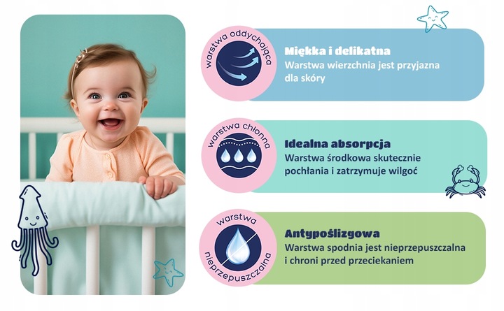 Miękka, oddychająca warstwa wierzchnia: Wierzchnia warstwa podkładu jest niezwykle miękka i delikatna, idealna dla delikatnej i wrażliwej skóry dziecka. Oddychająca struktura jest przyjazna skórze dziecka i minimalizuje ryzyko jej podrażnienia.