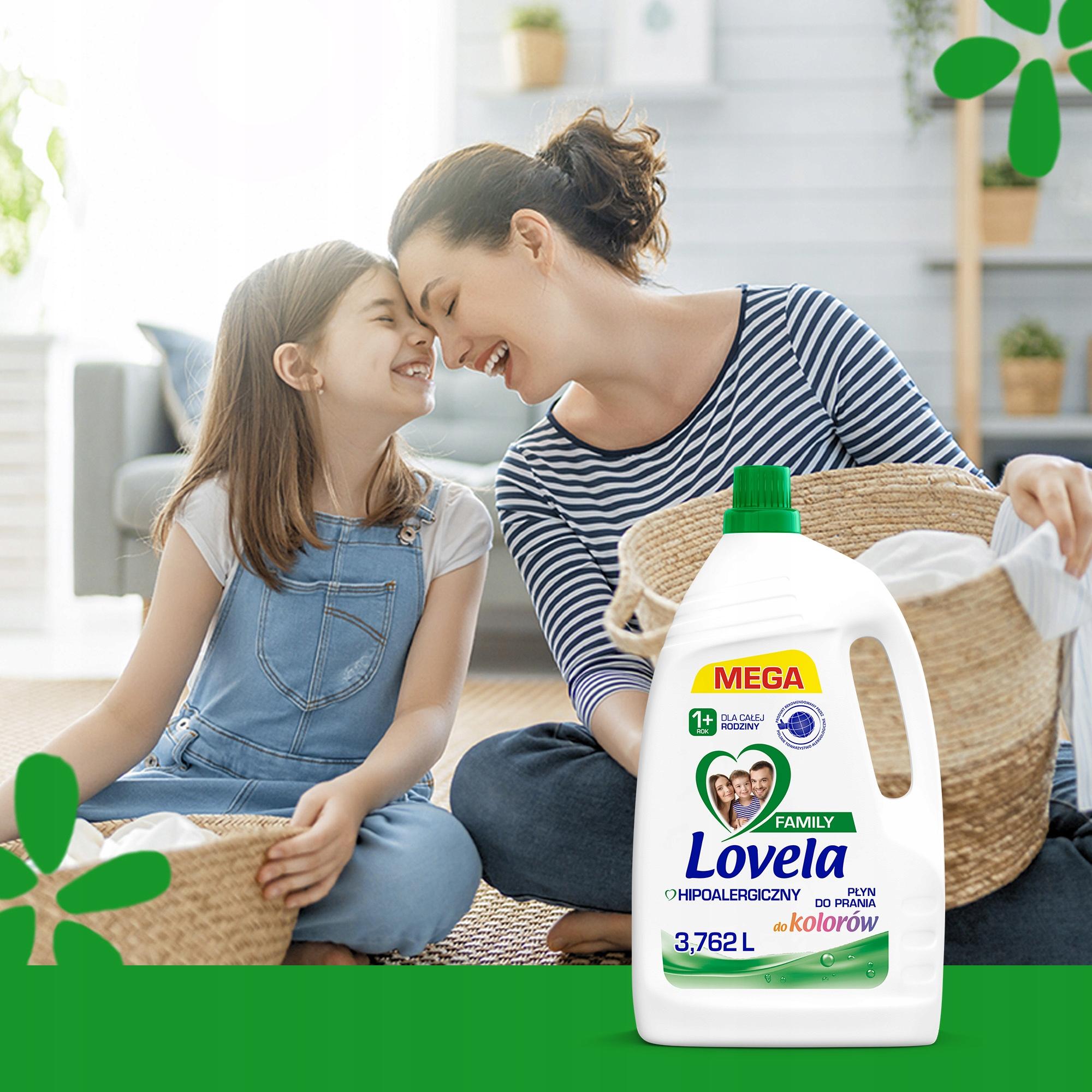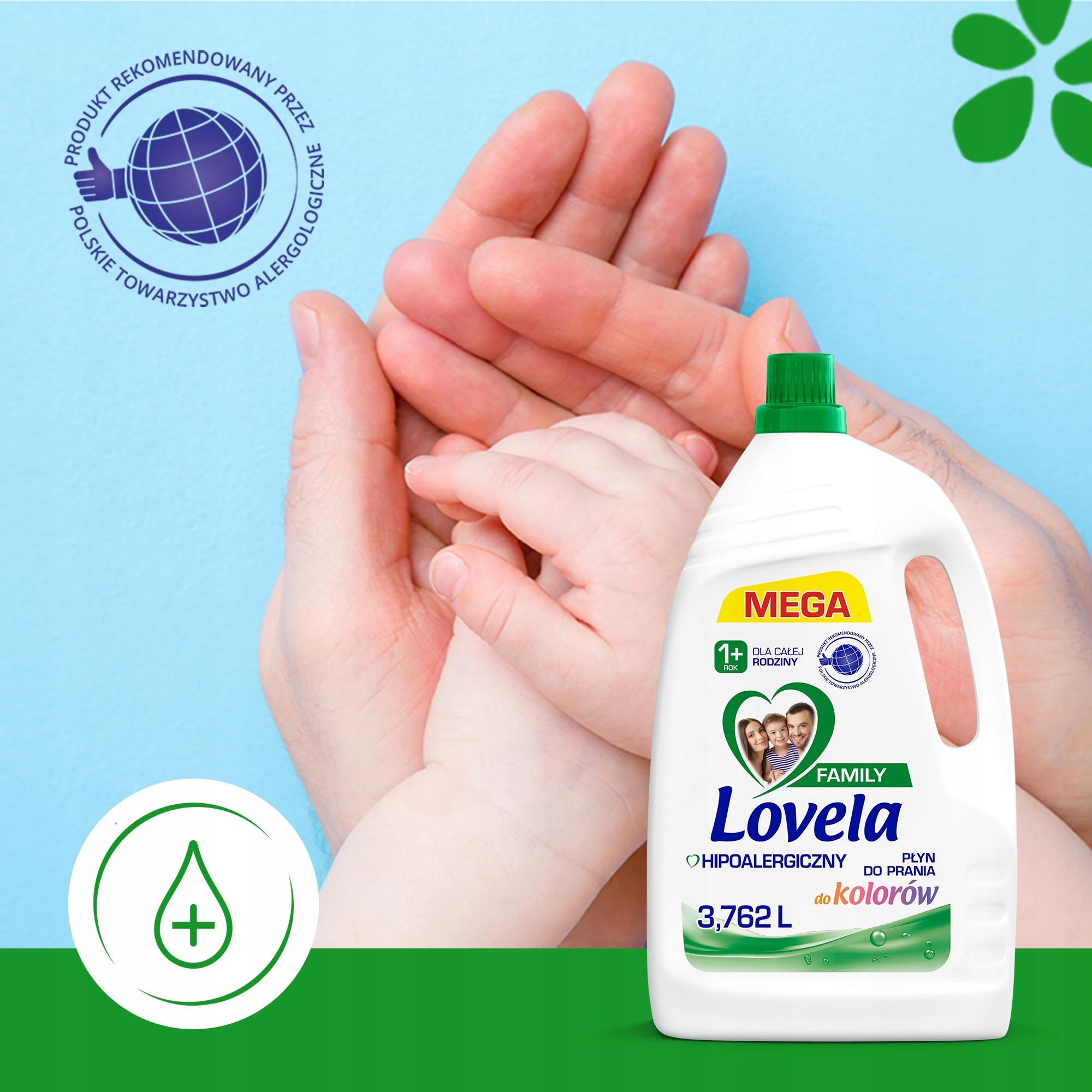 Płyn Lovela Family został stworzony z myślą o skórze wrażliwej oraz ze skłonnościami do alergii. Zmniejsza ryzyko podrażnień skóry i jest delikatny dla skóry oraz ubrań.