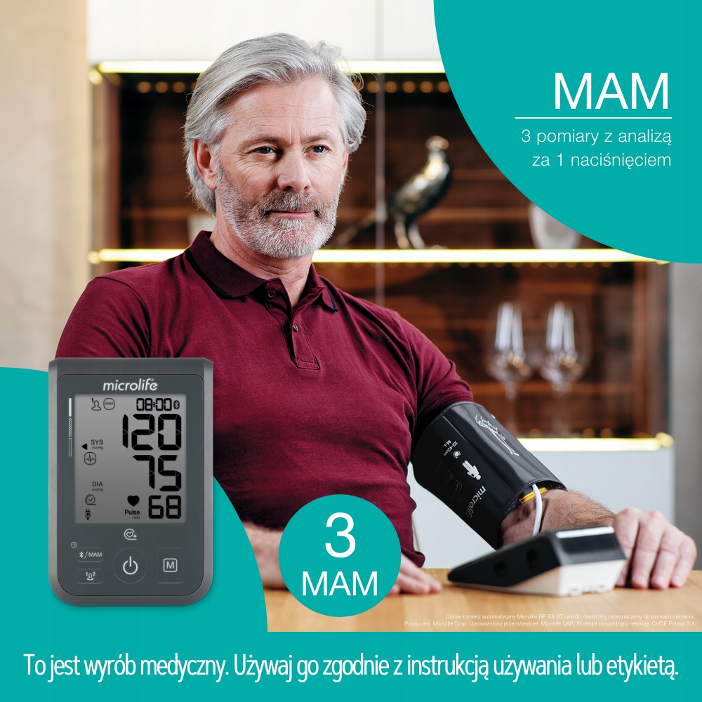 Technologia MAM (Microlife Average Mode) to funkcja, która automatycznie wykonuje trzy kolejne pomiary ciśnienia krwi i oblicza ich średnią. Dzięki temu: