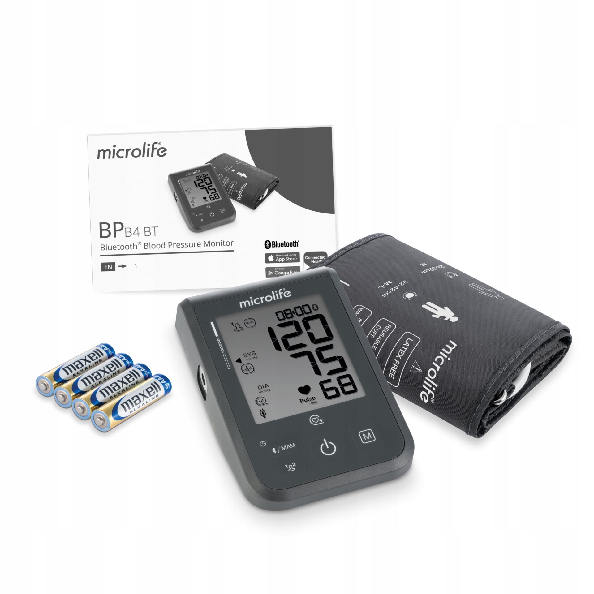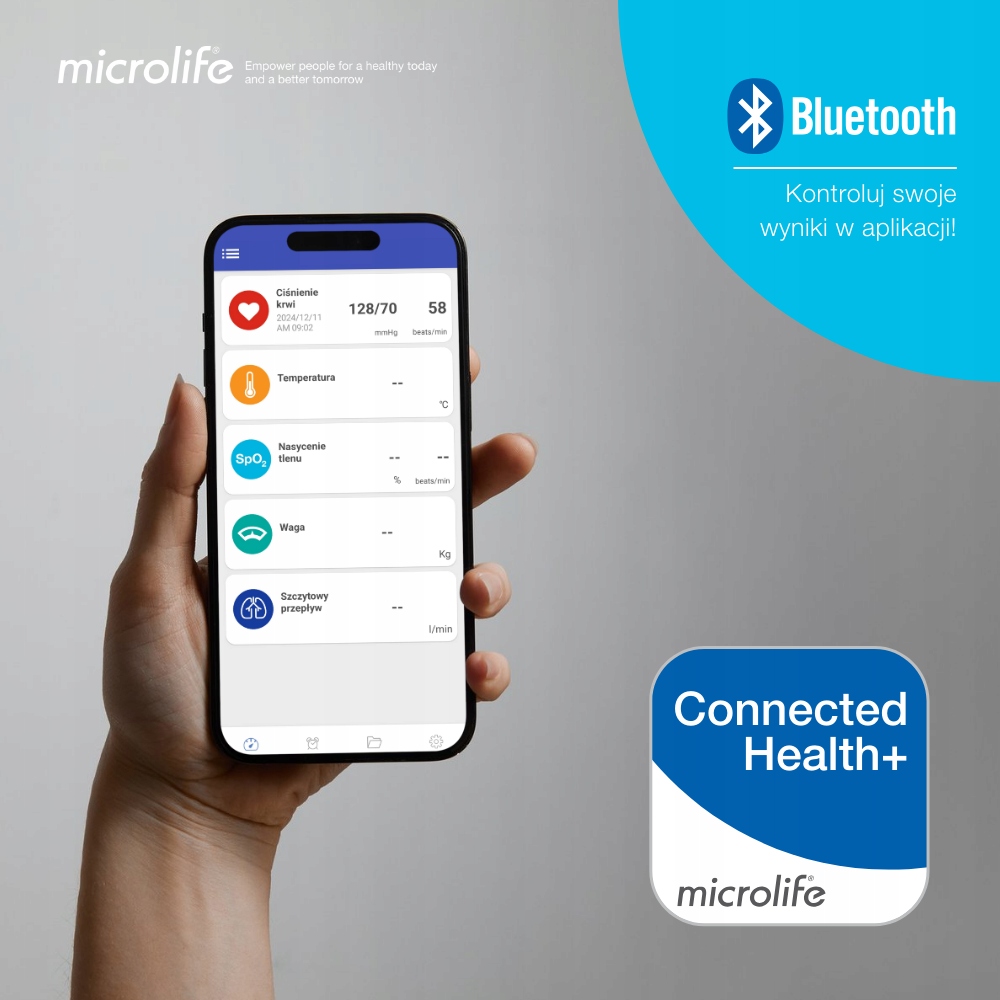 Ciśnieniomierz Microlife BP B4 BT został wyposażony w funkcję Bluetooth®, co umożliwia bezprzewodowe połączenie z aplikacją Microlife Connected Health+ na smartfonie. Dzięki temu: