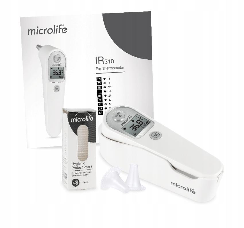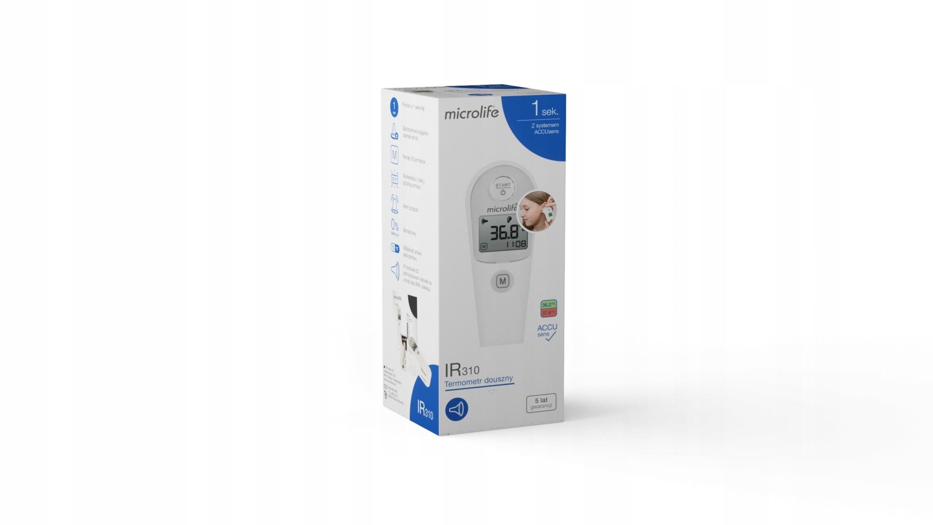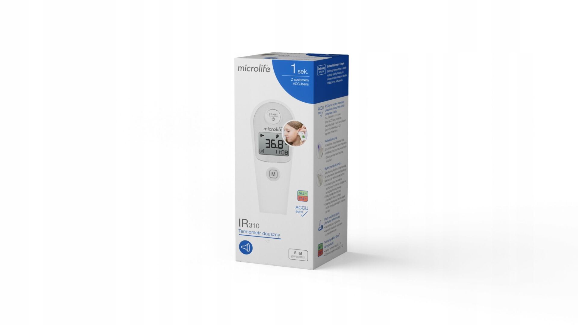 Microlife IR 310 to zaawansowany termometr douszny na podczerwień, zaprojektowany do błyskawicznego pomiaru temperatury ciała w zaledwie 1 sekundę. Dzięki innowacyjnemu systemowi ACCUsens, umieszczenie sondy pomiarowej w uchu odbywa się precyzyjnie, gwarantując zawsze dokładny wynik pomiaru. Dodatkowo, termometr wyposażony jest w wymienne osłonki na sondę pomiarową, które nie tylko zapewniają higieniczne użytkowanie, ale są również wolne od szkodliwego bisfenolu A.
